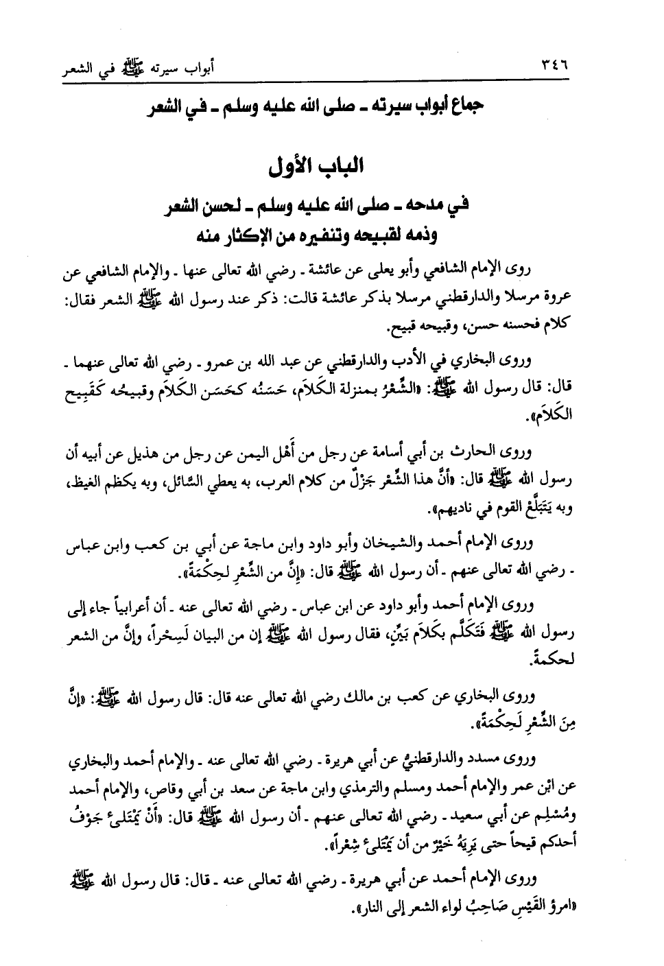الباب الأول في مدحه- صلى الله عليه وسلم- لحسن الشعر وذمّه لقبيحه وتنفيره من الإكثار منه