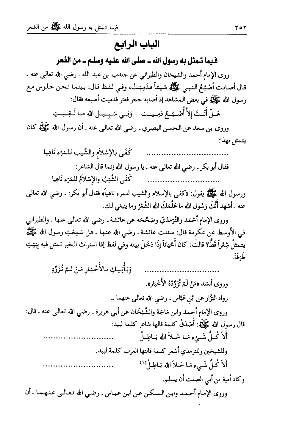 الباب الرابع فيما تمثل به رسول اللَّه- صلى اللَّه عليه وسلم- من الشعر