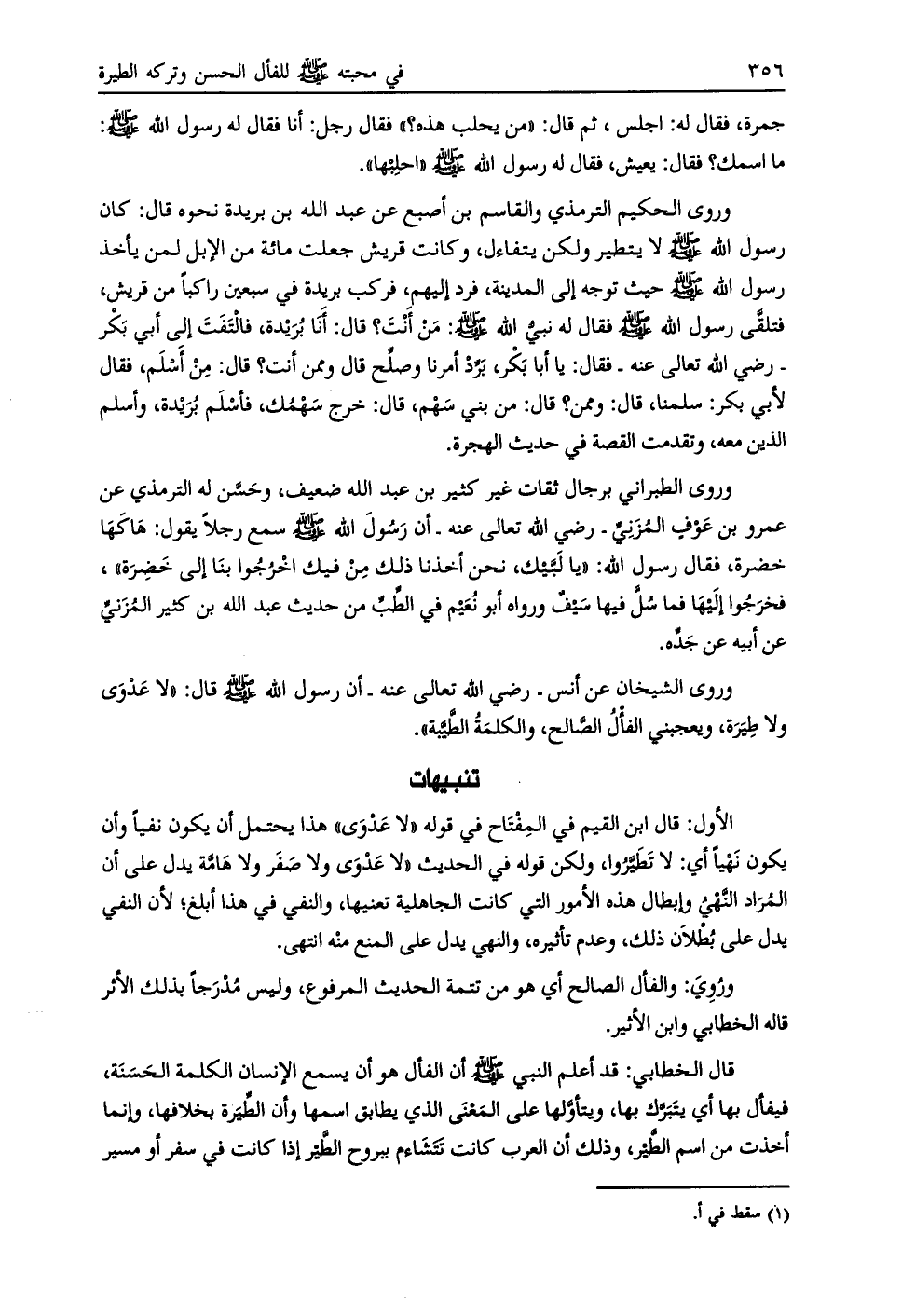 وروى الحكيم الترمذي والقاسم بن أصبع عن عبد اللَّه بن بريدة نحوه قال: كان رسول اللَّه صلى اللَّه عليه وسلم لا يتطير ولكن يتفاءل، وكانت قريش جعلت مائة من الإبل لمن يأخذ رسول اللَّه صلى اللَّه عليه وسلم حيث توجه إلى المدينة، فرد إليهم، فركب بريدة في سبعين راكبا من قريش، فتلقّى رسول اللَّه صلى اللَّه عليه وسلم فقال له نبي اللَّه صلّى اللَّه عليه وسلم: من أنت؟ قال: أنا بريدة، فالتفت إلى أبي بكر- رضي اللَّه تعالى عنه- فقال: يا أبا بكر، برّد أمرنا وصلّح قال وممن أنت؟ قال: من أسلم، فقال لأبي بكر: سلمنا، قال: وممن؟ قال: من بني سهم، قال: خرج سهمك، فأسلم بريدة، وأسلم الذين معه،