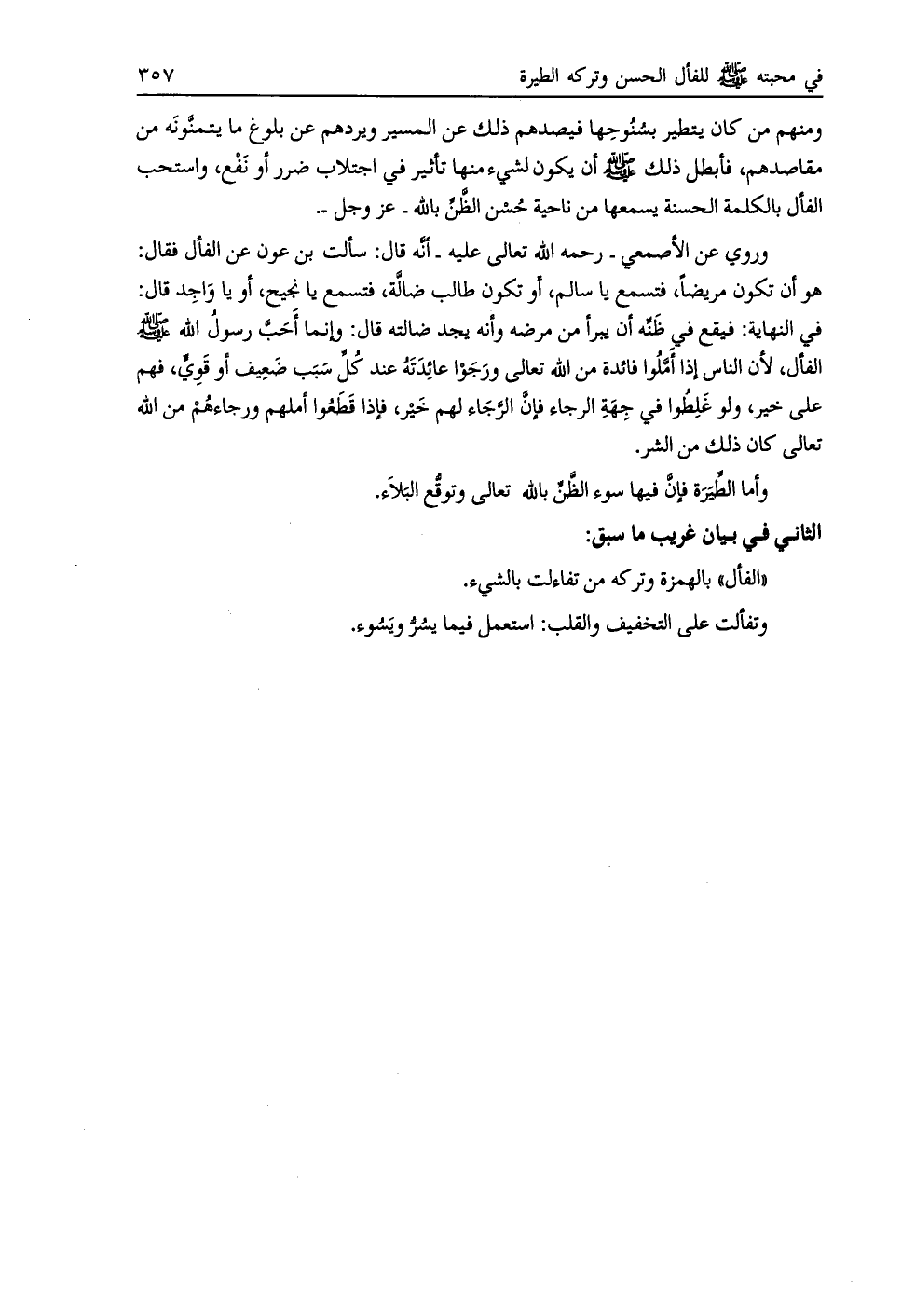وروى عن الأصمعي- رحمه اللَّه تعالى عليه- أنه قال: سألت بن عون عن الفأل فقال: