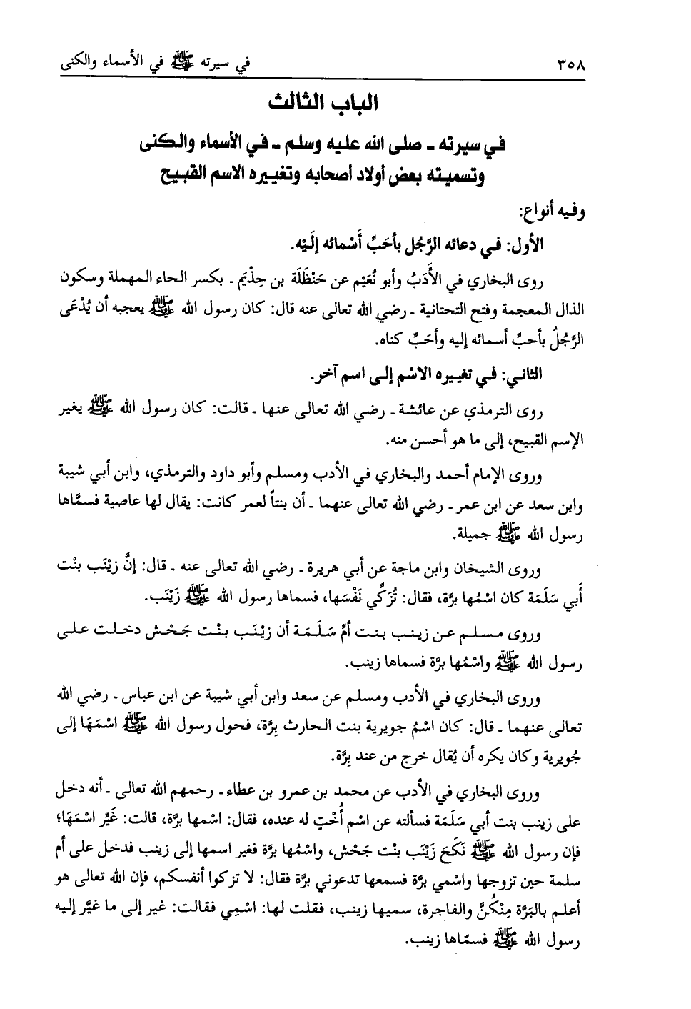 الباب الثالث في سيرته- صلّى الله عليه وسلم- في الأسماء والكنى وتسميته بعض أولاد أصحابه وتغييره الاسم القبيح