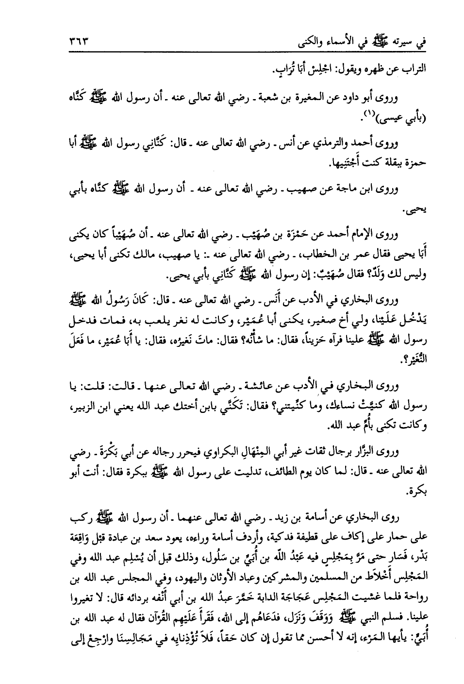 وروى البخاري في الأدب عن عائشة- رضي اللَّه تعالى عنها- قالت: قلت: يا رسول اللَّه كنيّت نساءك، وما كنّيتني؟ فقال: تكني بابن أختك عبد اللَّه يعني ابن الزبير،