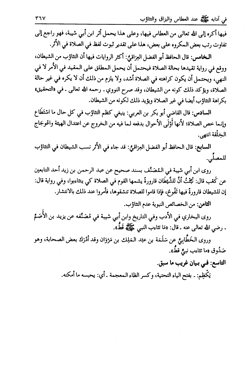 السابع: قال الحافظ أبو الفضل العراقيّ: قد جاء في الأثر نسب الشيطان في التثاؤب للمصلّي.