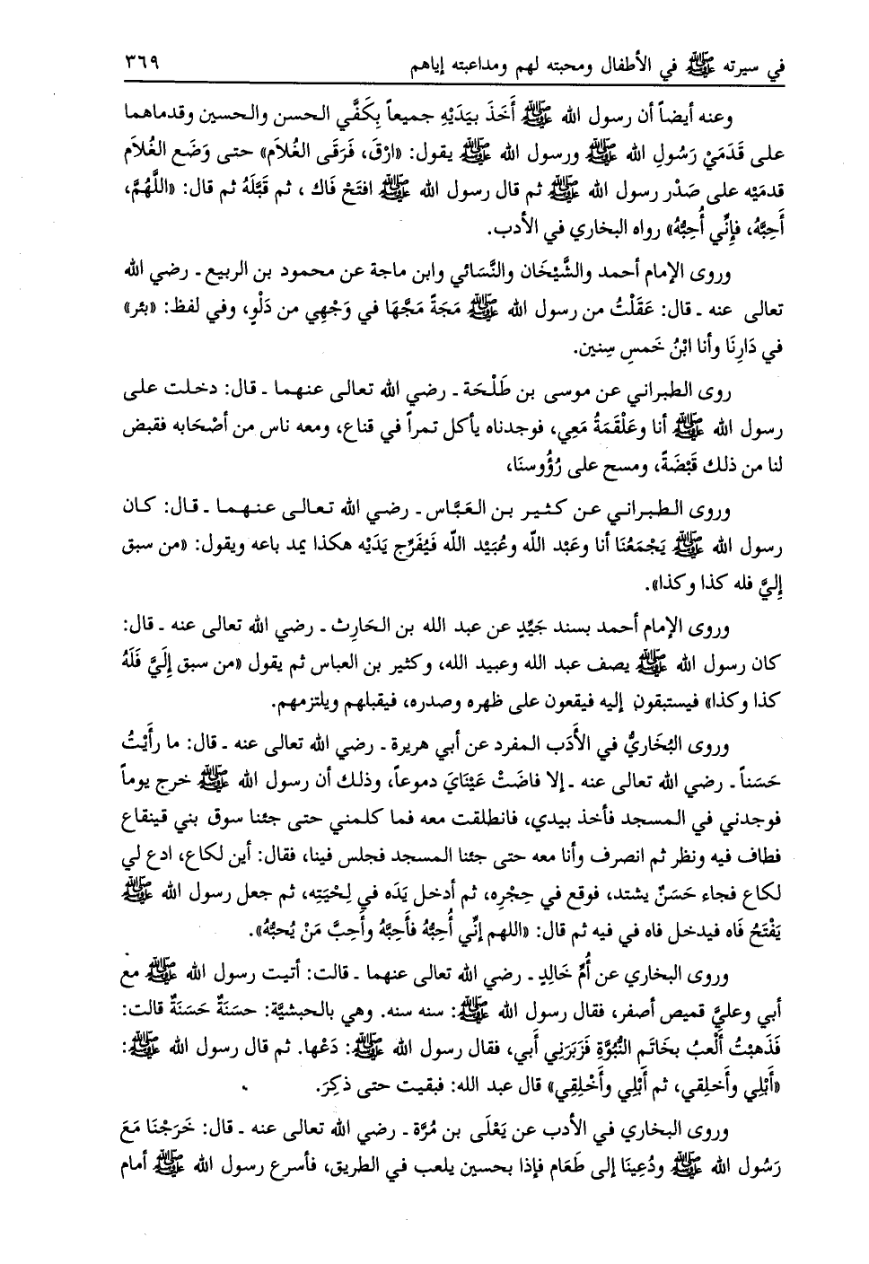 وروى البخاري في الأدب المفرد عن أبي هريرة- رضي الله تعالى عنه- قال: ما رأيت حسنا- رضي الله تعالى عنه- إلا فاضت عيناي دموعا، وذلك أن رسول الله صلى الله عليه وسلم خرج يوما فوجدني في المسجد فأخذ بيدي، فانطلقت معه فما كلمني حتى جئنا سوق بني قينقاع فطاف فيه ونظر ثم انصرف وأنا معه حتى جئنا المسجد فجلس فينا، فقال: أين لكاع، ادع لي لكاع فجاء حسن يشتد، فوقع في حجره، ثم أدخل يده في لحيته، ثم جعل رسول الله صلى الله عليه وسلم يفتح فاه فيدخل فاه في فيه ثم قال: «اللهم إني أحبه فأحبه وأحب من يحبّه» .