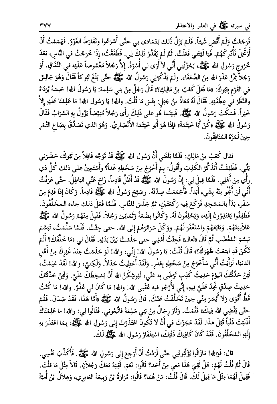 فلمّا سلّمت، تبسّم تبسّم المغضب ثمّ قال «تعال» فجئت أمشي حتى جلست بين يديه. فقال لي «ما خلّفك؟ ألم تكن قد ابتعت ظهرك؟» قال قلت: يا رسول اللَّه! إني، واللَّه! لو جلست عند غيرك من أهل الدنيا، لرأيت أنّي سأخرج من سخطه بعذر. ولقد أعطيت جدلا. ولكنيّ، واللَّه! لقد علمت، لئن حدّثتك اليوم حديث كذب ترضى به عنّي، ليوشكنّ اللَّه أن يسخطك عليّ. ولئن حدّثتك حديث صدق تجد عليّ فيه، إنّي لأرجو فيه عقبى اللَّه. واللَّه! ما كان لي عذر. واللَّه! ما كنت قطّ أقوى ولا أيسر منّي حين تخلّفت عنك. قال رسول اللَّه صلى اللَّه عليه وسلم «أمّا هذا، فقد صدق. فقم حتى يقضي اللَّه فيك» فقمت.