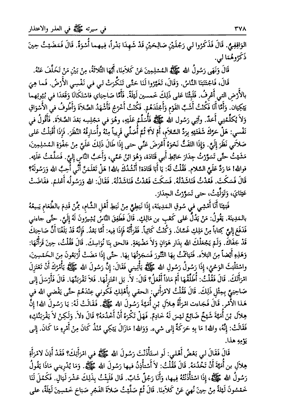 قال، فاجتنبنا النّاس. وقال، تغيّروا لنا حتّى تنكّرت لي في نفسي الأرض. فما هي بالأرض التي أعرف. فلبثنا على ذلك خمسين ليلة. فأمّا صاحباي فاستكانا وقعدا في بيوتهما يبكيان. وأمّا أنا فكنت أشبّ القوم وأجلدهم. فكنت أخرج فأشهد الصّلاة وأطوف في الأسواق ولا يكلّمني أحد. وأتى رسول اللَّه صلى اللَّه عليه وسلم فأسلّم عليه، وهو في مجلسه بعد الصّلاة. فأقول في نفسي: هل حرّك شفتيه بردّ السّلام، أم لا؟ ثم أصلّي قريبا منه وأسارقه النّظر. فإذا أقبلت على صلاتي نظر إليّ. وإذا التفتّ نحوه أعرض عنّي حتى إذا طال ذلك عليّ من جفوة المسلمين، مشيت حتّى تسوّرت جدار حائط أبي قتادة، وهو ابن عمّي، وأحبّ النّاس إليّ. فسلّمت عليه.