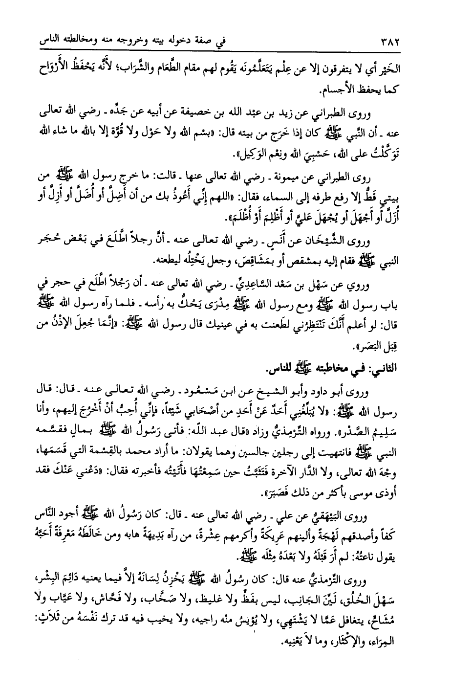 وروى الترمذي عنه قال: كان رسول اللَّه صلى اللَّه عليه وسلم يخزن لسانه إلّا فيما يعنيه دائم البشر، سهل الخلق، ليّن الجانب، ليس بفظ ولا غليظ، ولا صخّاب، ولا فحّاش، ولا عيّاب ولا مشاحّ، يتغافل عمّا لا يشتهي، ولا يؤيس منه راجيه، ولا يخيب فيه قد ترك نفسه من ثلاث: