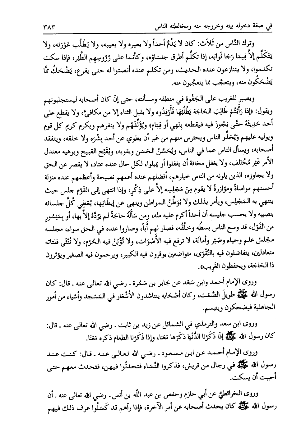 ويصبر للغريب على الجفوة في منطقه ومسألته، حتى إن كان أصحابه ليستجلبونهم ويقول: «إذا رأيتم طالب الحاجة يطلبها فأرفدوه ولا يقبل الثناء إلا من مكافئ، ولا يقطع على أحد حديثه حتّى يجوز فيه فيقطعه بنهي أو قيام» ويؤلّفهم ولا ينفرهم ويكرم كريم كل قوم ويوليه عليهم ويحذّر الناس ويحترس منهم من غير أن يطوي عن أحد بشره ولا خلقه، ويتفقد أصحابه، ويسأل الناس عما في الناس، ويحسّن الحسن ويقويه، ويقبّح القبيح ويوهيه معتدل الأمر غير مختلف، ولا يغفل مخافة أن يغفلوا أو يميلوا، لكل حال عنده عتاد، لا يقصر عن الحق ولا يجاوزه، الذين يلونه من الناس خيارهم، أفضلهم عنده أعمهم نصيحة وأعظمهم عنده منزلة أحسنهم مواساة ومؤازرة لا يقوم من مجلسه إلّا على ذكر، وإذا انتهى إلى القوم جلس حيث ينتهي به المجلس، ويأمر بذلك ولا يوطّن المواطن وينهى عن إيطانها، يعطي كلّ جلسائه بنصيبه ولا يحسب جليسه أن أحدا أكرم عليه منه، ومن سأله حاجة لم يردّه إلّا بها، أو بميسور من القول، قد وسع الناس بسطه وخلقه، فصار لهم أبا، وصاروا عنده في الحق سواء، مجلسه مجلس علم وحياء وصبر وأمانة، لا ترفع فيه الأصوات، ولا تؤبن فيه الحرم، ولا تنثى فلتاته متعادلين، يتفاضلون فيه بالتّقوى، متواضعين يوقرون فيه الكبير، ويرحمون فيه الصغير ويؤثرون ذا الحاجة، ويحفظون الغريب» .