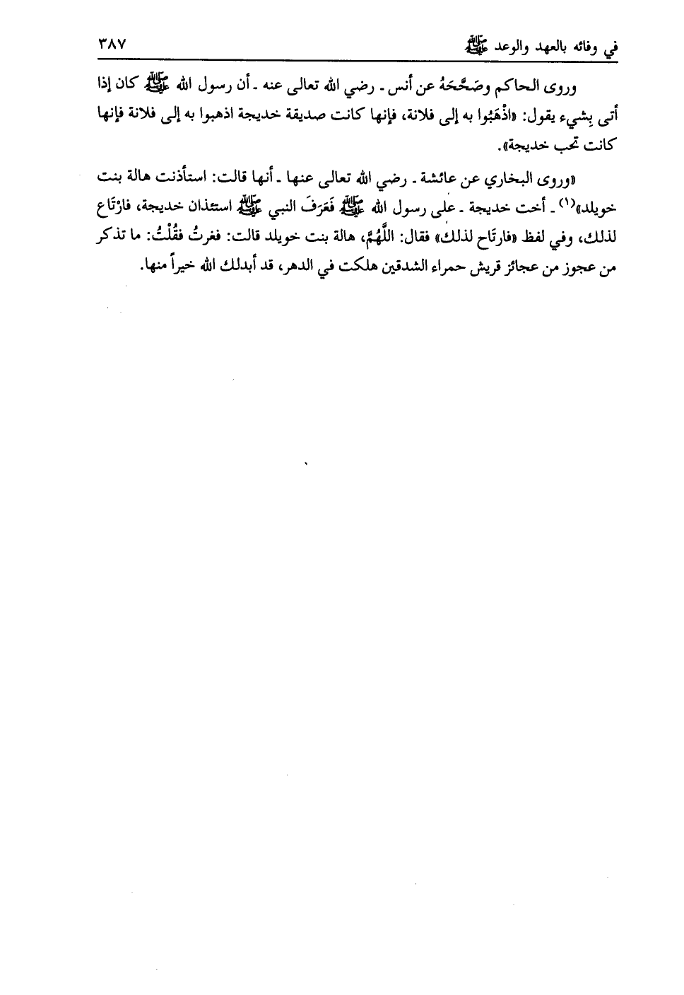 وروى الحاكم وصححه عن أنس- رضي اللَّه تعالى عنه- أن رسول اللَّه صلى اللَّه عليه وسلم كان إذا أتى بشيء يقول: «اذهبوا به إلى فلانة، فإنها كانت صديقة خديجة اذهبوا به إلى فلانة فإنها كانت تحب خديجة» .