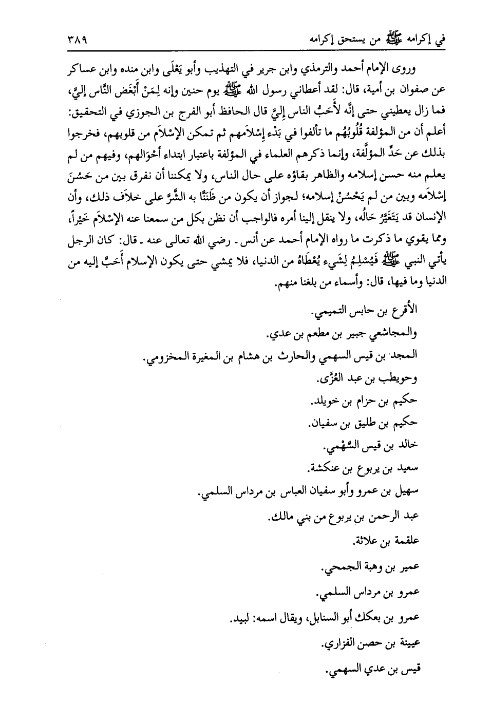 وروى الإمام أحمد والترمذي وابن جرير في التهذيب وأبو يعلى وابن منده وابن عساكر عن صفوان بن أمية، قال: لقد أعطاني رسول اللَّه صلى اللَّه عليه وسلم يوم حنين وإنه لمن أبغض النّاس إليّ، فما زال يعطيني حتى إنّه لأحبّ الناس إليّ قال الحافظ أبو الفرج بن الجوزي في التحقيق: