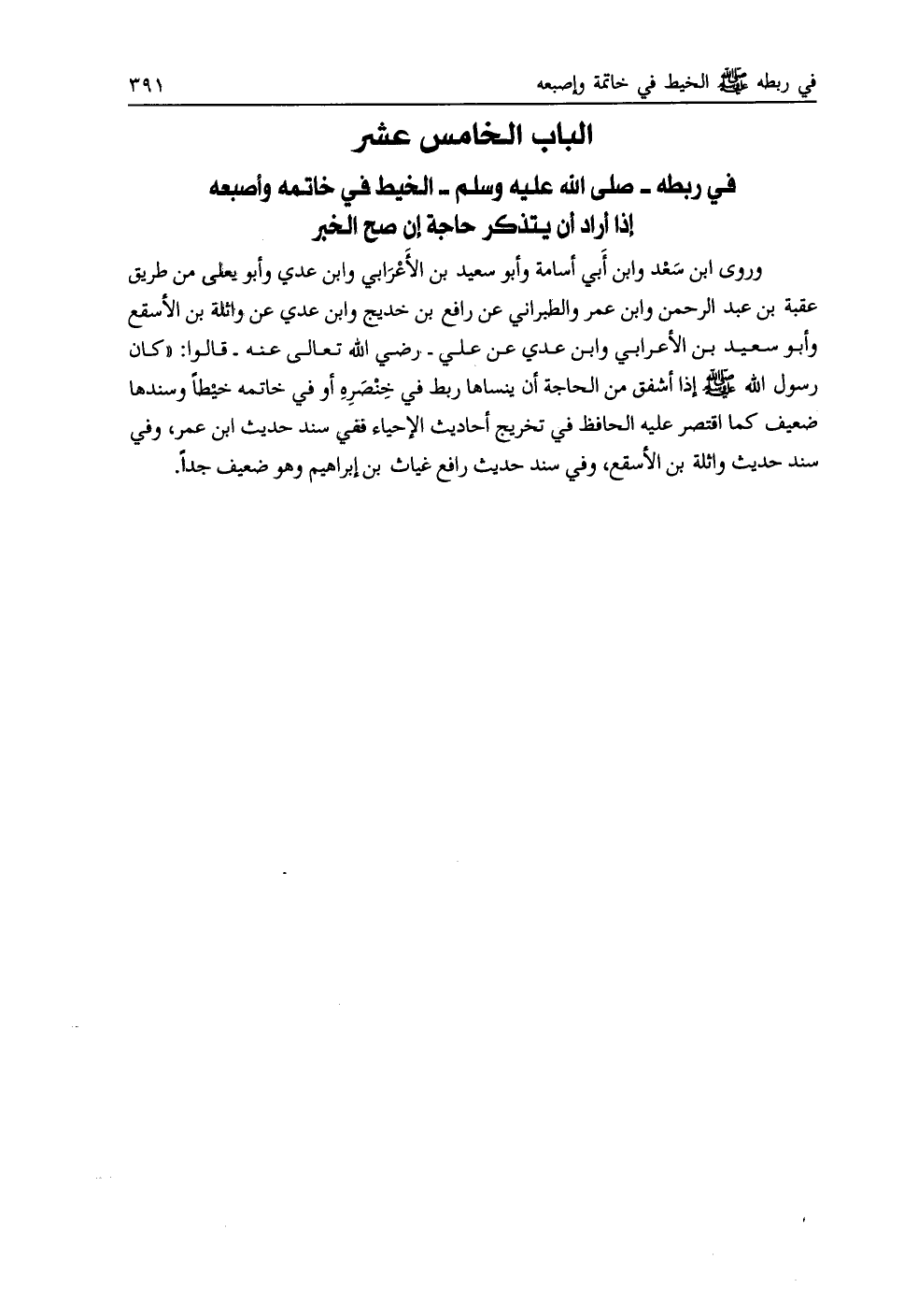 الباب الخامس عشر في ربطه- صلى اللَّه عليه وسلم- الخيط في خاتمه وأصبعه إذا أراد أن يتذكر حاجة أن صح الخبر