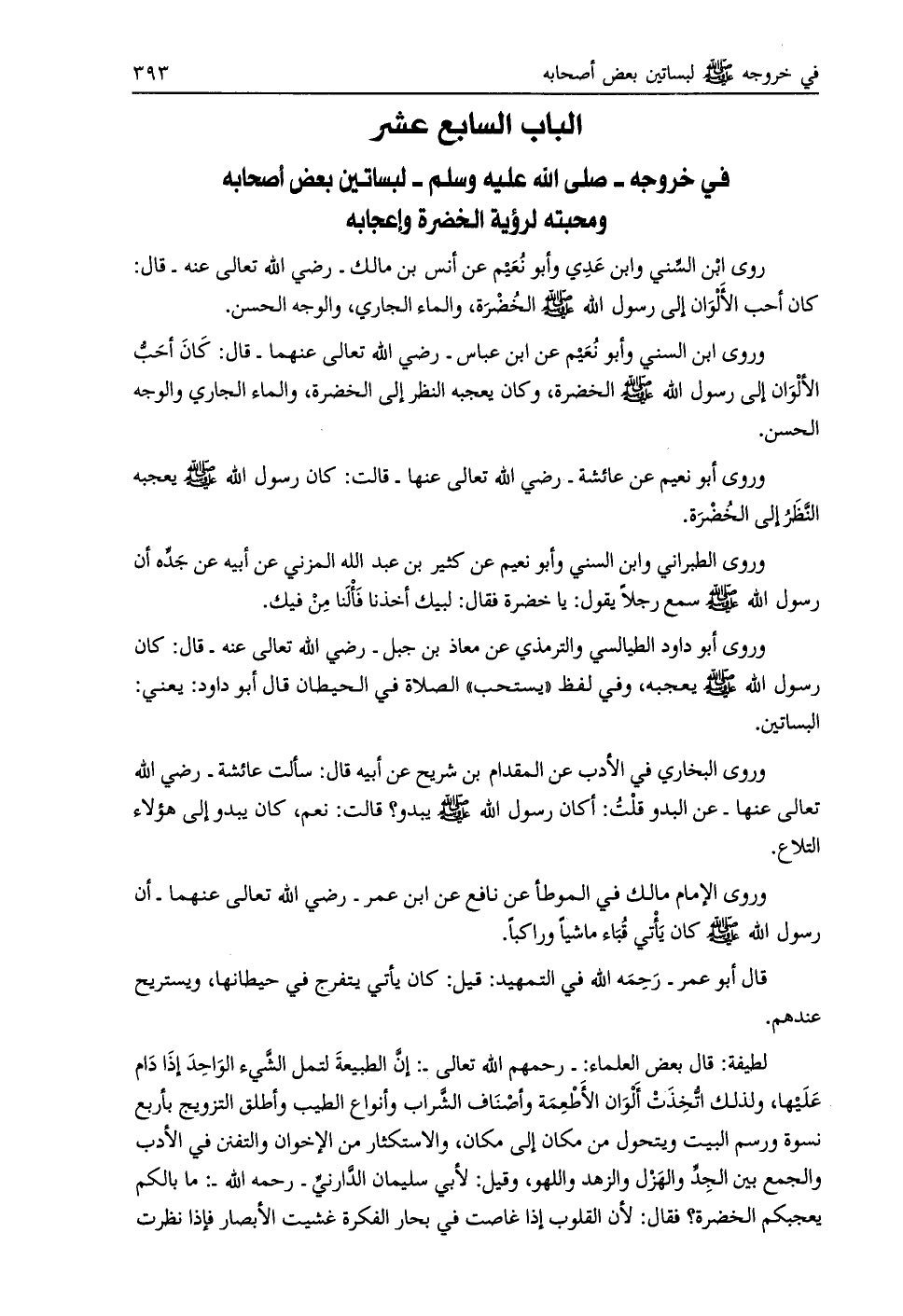 الباب السابع عشر في خروجه- صلى الله عليه وسلم- لبساتين بعض أصحابه ومحبته لرؤية الخضرة وإعجابه