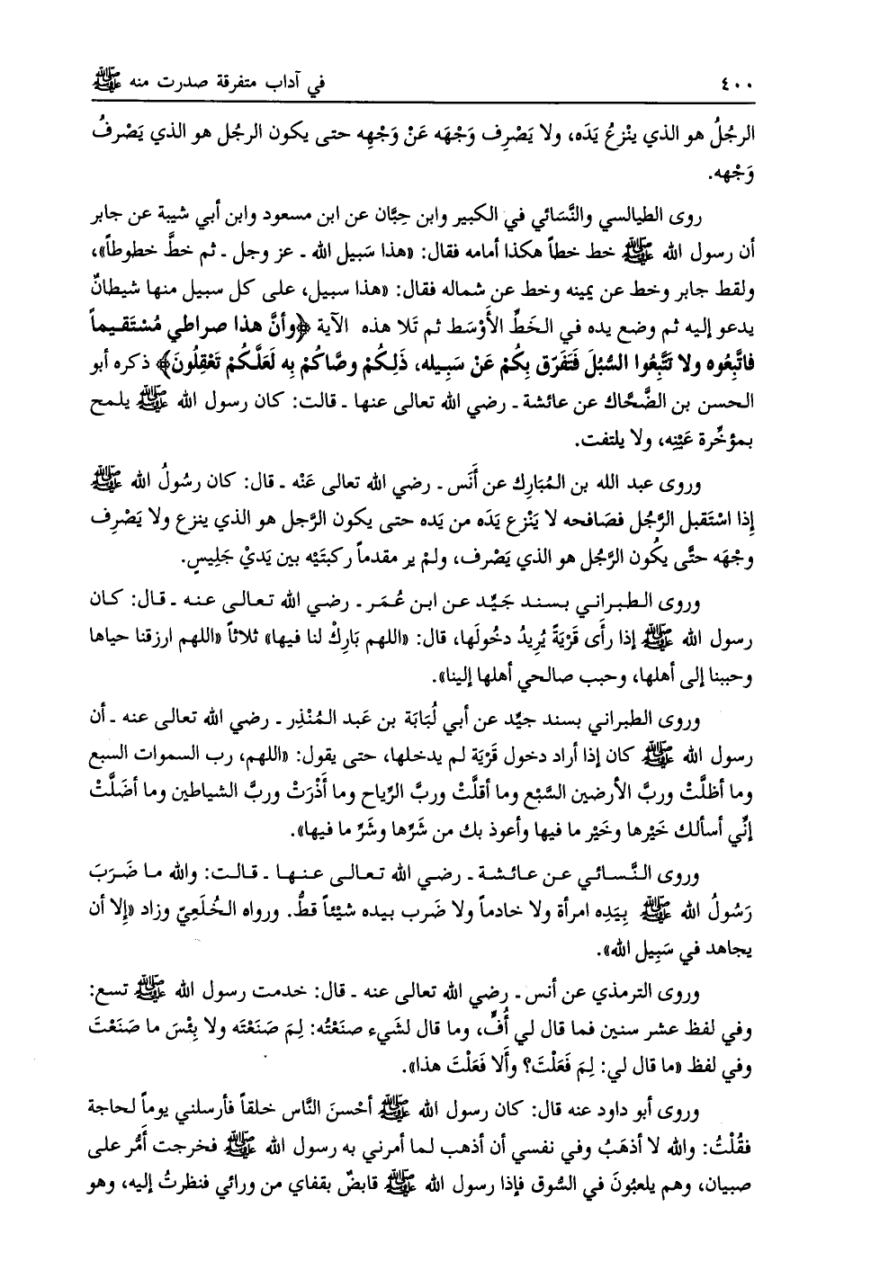 وروى عبد الله بن المبارك عن أنس- رضي الله تعالى عنه- قال: كان رسول الله صلى الله عليه وسلم إذا استقبل الرّجل فصافحه لا ينزع يده من يده حتى يكون الرّجل هو الذي ينزع ولا يصرف وجهه حتّى يكون الرّجل هو الذي يصرف، ولم ير مقدما ركبتيه بين يدي جليس.