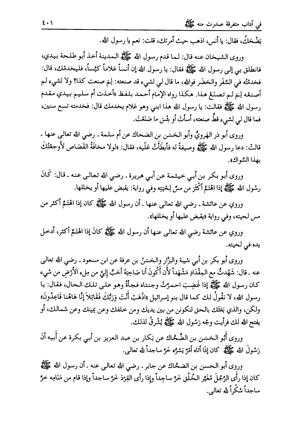وروى أبو الحسن بن الضحاك عن بكار بن عبد العزيز بن أبي بكرة عن أبيه أن رسول الله صلى الله عليه وسلم كان إذا أتاه أمر يسرّه خرّ ساجدا لله تعالى.