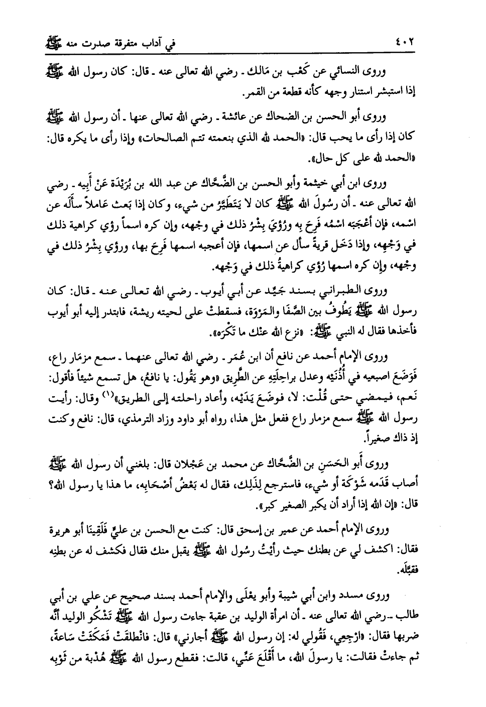وروى أبو الحسن بن الضحاك عن عائشة- رضي الله تعالى عنها- أن رسول الله صلى الله عليه وسلم كان إذا رأى ما يحب قال: «الحمد لله الذي بنعمته تتم الصالحات» وإذا رأى ما يكره قال: