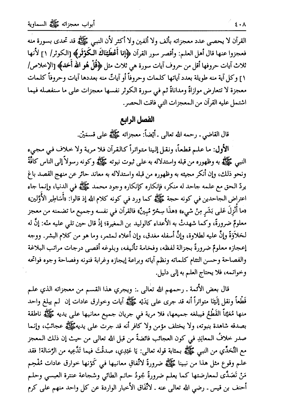 قال القاضي- رحمه الله تعالى- أيضا: معجزاته صلى الله عليه وسلم علي قسمين.