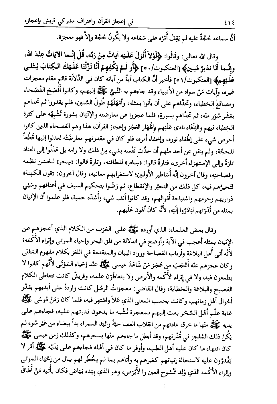 وقال الله تعالى: وقالوا: لَوْلا أُنْزِلَ عَلَيْهِ آياتٌ مِنْ رَبِّهِ، قُلْ إِنَّمَا الْآياتُ عِنْدَ اللَّهِ، وَإِنَّما أَنَا نَذِيرٌ مُبِينٌ [العنكبوت/ 50] أَوَلَمْ يَكْفِهِمْ أَنَّا أَنْزَلْنا عَلَيْكَ الْكِتابَ يُتْلى عَلَيْهِمْ [العنكبوت/ 51] فأخبر أنّ الكتاب آية من آياته كان في الدّلالة قائم مقام معجزات غيره، وآيات من سواه من الأنبياء وقد جاءهم به النبي صلى الله عليه وسلم إليهم، وكانوا أفصح الفصحاء ومصاقع الخطباء، وتحدّاهم على أن يأتوا بمثله، وأمهلهم طول السّنين، فلم يقدروا ثم تحداهم بعشر سور منه، ثم تحدّاهم بسورة، فلما عجزوا عن معارضته والإتيان بسورة تشبهه على كثرة الخطباء فيهم والبلغاء نادى عليهم بإظهار العجز وإعجاز القرآن، هذا وهم الفصحاء الذين كانوا أحرص شيء على إطفاء نوره، وإخفاء أمره، فلو كان في مقدرتهم معارضته لعدلوا إليها قطعا للحجّة، ولم ينقل عن أحد منهم أن حدّث نفسه بشيء من ذلك ولا رامه بل عدلوا إلى العناد تارة وإلى الاستهزاء أخرى، فتارة قالوا: «سحر» للطافته، وتارة قالوا: «سحر» لحسن نظمه وفصاحته، وقال آخرون إنّه أساطير الأولين، لاستغرابهم معانيه، وقال آخرون: «قول الكهنة» لتحيّرهم فيه، كل ذلك من التحيّر والانقطاع، ثم رضوا بتحكيم السيف في أعناقهم وسبي ذراريهم وحرمهم واستباحة أموالهم، وقد كانوا آنف شيء وأشدّه حمية، فلو علموا أن الإتيان بمثله من قدرتهم لبادروا إليه، لأنّه كان أهون عليهم.