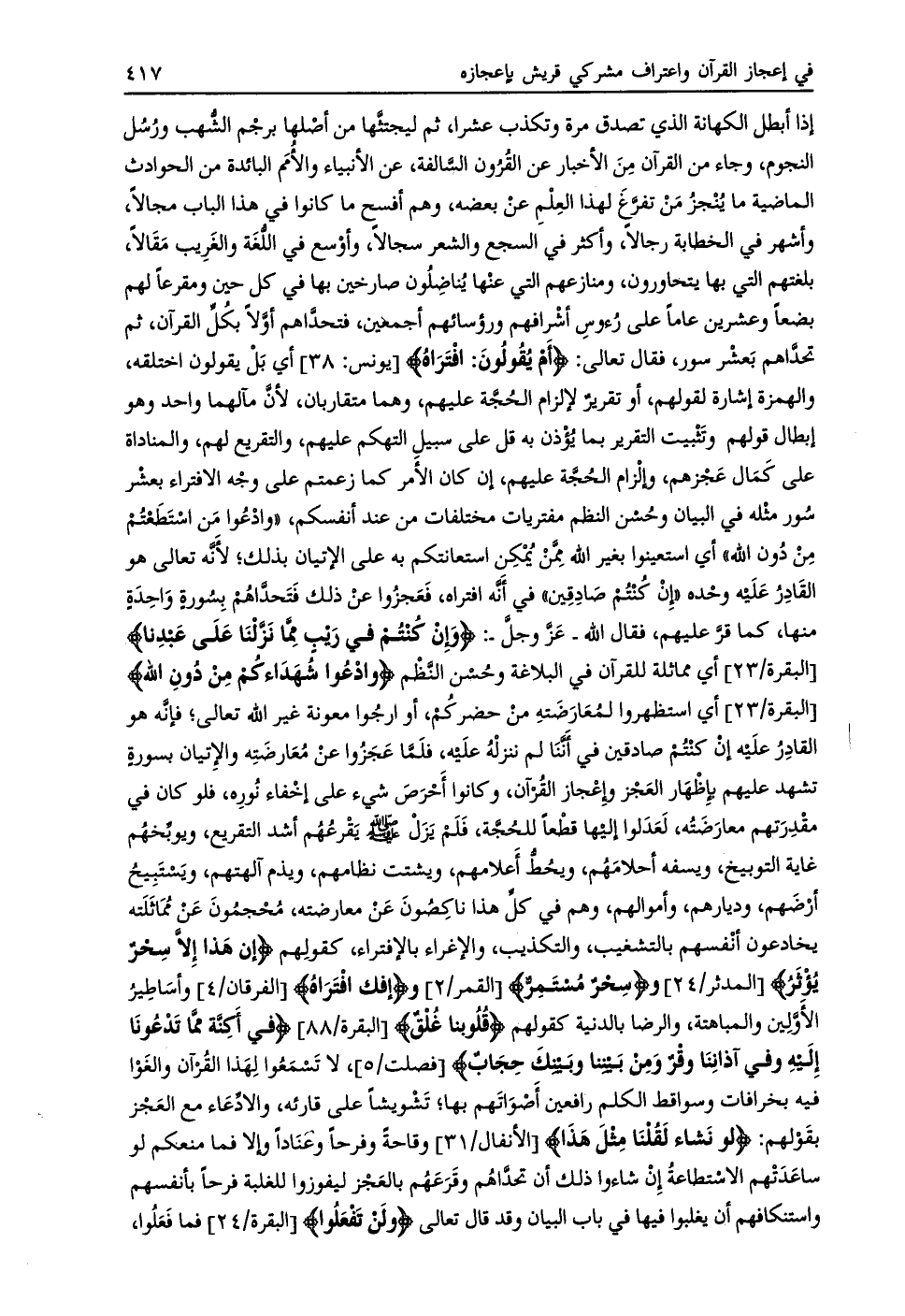 إذا أبطل الكهانة الذي تصدق مرة وتكذب عشرا، ثم ليجتثّها من أصلها برجم الشّهب ورسل النجوم، وجاء من القرآن من الأخبار عن القرون السّالفة، عن الأنبياء والأمم البائدة من الحوادث الماضية ما ينجز من تفرّغ لهذا العلم عن بعضه، وهم أفسح ما كانوا في هذا الباب مجالا، وأشهر في الخطابة رجالا، وأكثر في السجع والشعر سجالا، وأوسع في اللّغة والغريب مقالا، بلغتهم التي بها يتحاورون، ومنازعهم التي عنها يناضلون صارخين بها في كل حين ومقرعا لهم بضعا وعشرين عاما على رءوس أشرافهم ورؤسائهم أجمعين، فتحدّاهم أوّلا بكلّ القرآن، ثم تحدّاهم بعشر سور، فقال تعالى: أَمْ يَقُولُونَ: افْتَراهُ [يونس: 38] أي بل يقولون اختلقه، والهمزة إشارة لقولهم، أو تقرير لإلزام الحجّة عليهم، وهما متقاربان، لأنّ مآلهما واحد وهو إبطال قولهم وتثبيت التقرير بما يؤذن به قل على سبيل التهكّم عليهم، والتقريع لهم، والمناداة على كمال عجزهم، وإلزام الحجّة عليهم، إن كان الأمر كما زعمتم على وجه الافتراء بعشر سور مثله في البيان وحسن النظم مفتريات مختلفات من عند أنفسكم، «وادعوا من استطعتم من دون الله» أي استعينوا بغير الله ممّن يمكن استعانتكم به على الإتيان بذلك، لأنّه تعالى هو القادر عليه وحده «إن كنتم صادقين» في أنّه افتراه، فعجزوا عن ذلك فتحدّاهم بسورة واحدة منها، كما قرّ عليهم، فقال الله- عزّ وجلّ-: وَإِنْ كُنْتُمْ فِي رَيْبٍ مِمَّا نَزَّلْنا عَلى عَبْدِنا [البقرة/ 23] أي مماثلة للقرآن في البلاغة وحسن النّظم وَادْعُوا شُهَداءَكُمْ مِنْ دُونِ اللَّهِ [البقرة/ 23] أي استظهروا لمعارضته من حضركم، أو ارجوا معونة غير الله تعالى، فإنّه هو القادر عليه إن كنتم صادقين في أنّنا لم ننزله عليه، فلمّا عجزوا عن معارضته والإتيان بسورة تشهد عليهم بإظهار العجز وإعجاز القرآن، وكانوا أحرص شيء على إخفاء نوره، فلو كان في مقدرتهم معارضته، لعدلوا إليها قطعا للحجّة، فلم يزل صلى الله عليه وسلم يقرعهم أشد التقريع، ويوبّخهم غاية التوبيخ، ويسفه أحلامهم، ويحطّ أعلامهم، ويشتت نظامهم، ويذم آلهتهم، ويستبيح أرضهم، وديارهم، وأموالهم، وهم في كلّ هذا ناكصون عن معارضته، محجمون عن مماثلته يخادعون أنفسهم بالتشغيب، والتكذيب، والإغراء بالافتراء، كقولهم إِنْ هذا إِلَّا سِحْرٌ يُؤْثَرُ [المدثر/ 24] وسِحْرٌ مُسْتَمِرٌّ [القمر/ 2] وإِفْكٌ افْتَراهُ [الفرقان/ 4] وأساطير الأوّلين والمباهتة، والرضا بالدنية كقولهم قُلُوبُنا غُلْفٌ [البقرة/ 88] فِي أَكِنَّةٍ مِمَّا تَدْعُونا إِلَيْهِ وَفِي آذانِنا وَقْرٌ وَمِنْ بَيْنِنا وَبَيْنِكَ حِجابٌ [فصلت/ 5] ، لا تسمعوا لهذا القرآن والغوا فيه بخرافات وسواقط الكلم رافعين أصواتهم بها، تشويشا على قارئه، والادّعاء مع العجز بقولهم: لَوْ نَشاءُ لَقُلْنا مِثْلَ هذا [الأنفال/ 31] وقاحة وفرحا وعنادا وإلا فما منعكم لو ساعدتهم الاستطاعة إن شاءوا ذلك أن تحدّاهم وقرعهم بالعجز ليفوزوا للغلبة فرحا بأنفسهم واستنكافهم أن يغلبوا فيها في باب البيان وقد قال تعالى وَلَنْ تَفْعَلُوا [البقرة/ 24] فما فعلوا،