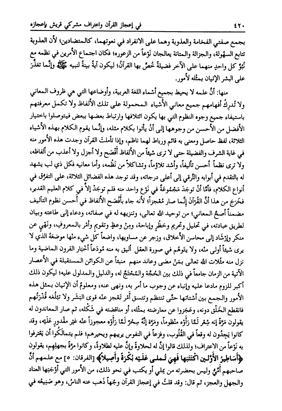 بجمع صفتي الفخامة والعذوبة وهما على الانفراد في نعوتهما، كالمتضادين، لأن العذوبة تتابع السهولة، والجزالة والمتانة يعالجان نوعا من الزعورة، فكان اجتماع الأمرين في نظمه مع نبوّ كل واحد منهما على الآخر فضيلة خصّ بها القرآن، ليكون آية بينة لنبيه صلى الله عليه وسلم وإنما تعذّر على البشر الإتيان بمثله لأمور.