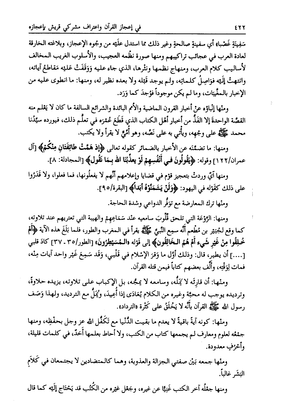 سفينة غصبا» أي سفينة صالحة وغير ذلك مما استدل عليه من وجوه الإعجاز، وبلاغته الخارقة لعادة العرب في عجائب تراكيبهم ومنها صورة نظمة العجيب، والأسلوب الغريب المخالف لأساليب كلام العرب، ومنهاج نظمها ونثرها، الذي جاء عليه ووقفت عليه مقاطع آياته، وانتهت إليه فواصل كلماته، ولم يوجد قبله ولا بعده نظير له، ومنها: ما انطوى عليه من الإخبار بالمغّيبات، وما لم يكن موجوداً فوجد كما ورد.