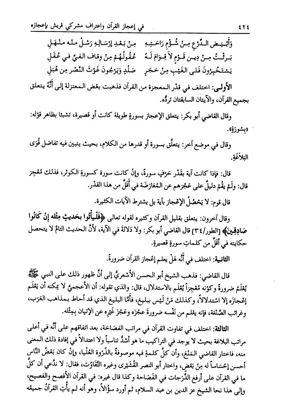 وقال آخرون: يتعلق بقليل القرآن وكثيره لقوله تعالى فَلْيَأْتُوا بِحَدِيثٍ مِثْلِهِ إِنْ كانُوا صادِقِينَ [الطور/ 34] قال القاضي أبو بكر: ولا دلالة في الآية، لأنّ الحديث التامّ لا يتحصل حكايته في أقل من كلمات سورة قصيرة.