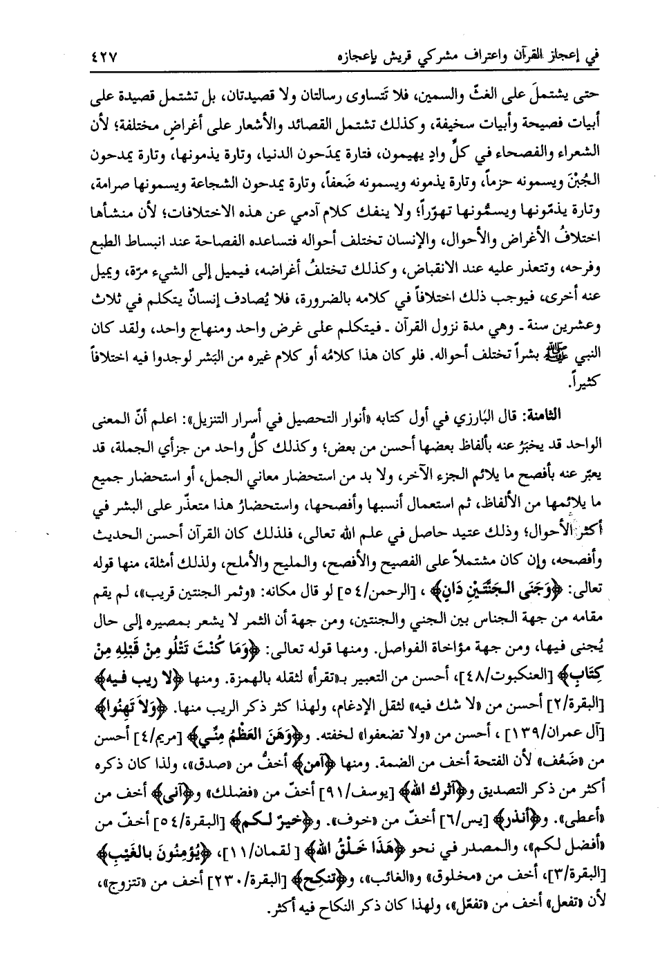 الثامنة: قال البارزي في أول كتابه «أنوار التحصيل في أسرار التنزيل» : اعلم أنّ المعنى الواحد قد يخبر عنه بألفاظ بعضها أحسن من بعض، وكذلك كل واحد من جزأي الجملة، قد يعبّر عنه بأفصح ما يلائم الجزء الآخر، ولا بد من استحضار معاني الجمل، أو استحضار جميع ما يلائمها من الألفاظ، ثم استعمال أنسبها وأفصحها، واستحضار هذا متعذّر على البشر في أكثر الأحوال، وذلك عتيد حاصل في علم الله تعالى، فلذلك كان القرآن أحسن الحديث وأفصحه، وإن كان مشتملا على الفصيح والأفصح، والمليح والأملح، ولذلك أمثلة، منها قوله تعالى: وَجَنَى الْجَنَّتَيْنِ دانٍ، [الرحمن/ 54] لو قال مكانه: «وثمر الجنتين قريب» ، لم يقم مقامه من جهة الجناس بين الجني والجنتين، ومن جهة أن الثمر لا يشعر بمصيره إلى حال يجنى فيها، ومن جهة مؤاخاة الفواصل. ومنها قوله تعالى: وَما كُنْتَ تَتْلُوا مِنْ قَبْلِهِ مِنْ كِتابٍ [العنكبوت/ 48] ، أحسن من التعبير ب «تقرأ» لثقله بالهمزة. ومنها لا رَيْبَ فِيهِ [البقرة/ 2] أحسن من «لا شك فيه» لثقل الإدغام، ولهذا كثر ذكر الريب منها. وَلا تَهِنُوا [آل عمران/ 139] ، أحسن من «ولا تضعفوا» لخفته. ووَهَنَ الْعَظْمُ مِنِّي [مريم/ 4] أحسن من «ضعف» لأن الفتحة أخف من الضمة. ومنها آمَنَ أخفّ من «صدق» ، ولذا كان ذكره أكثر من ذكر التصديق وآثَرَكَ اللَّهُ [يوسف/ 91] أخفّ من «فضلك» وآتَى أخف من «أعطى» . وأُنْذِرَ [يس/ 6] أخفّ من «خوف» . وخَيْرٌ لَكُمْ [البقرة/ 54] أخفّ من «أفضل لكم» ، والمصدر في نحو هذا خَلْقُ اللَّهِ [لقمان/ 11] ، يُؤْمِنُونَ بِالْغَيْبِ [البقرة/ 3] ، أخف من «مخلوق» و «الغائب» ، وتَنْكِحَ [البقرة/ 230] أخف من «تتزوج» ، لأن «تفعل» أخف من «تفعّل» ، ولهذا كان ذكر النكاح فيه أكثر.