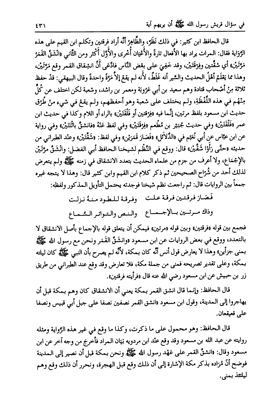 قال الحافظ ابن كثير: في ذلك نظر، والظّاهر أنّه أراد فرقتين وتكلم ابن القيم على هذه الرّواية فقال: المرات يراد بها الأفعال تارة والأعيان أخرى والأوّل أكثر ومن الثّاني «انشقّ القمر مرّتين» أي شقّتين وفرقتين، وقد خفي على بعض النّاس فادّعى أنّ انشقاق القمر وقع مرّتين، وهذا مما يعلم أهل الحديث والسّير أنه غلط، لأنه لم يقع إلّا مرّة واحدة وقال البيهقي: قد حفظ ثلاثة من أصحاب قتادة وهم سعيد بن أبي عروبة ومعمر بن راشد، وشعبة لكن اختلف عن كلّ منهم في هذه اللّفظة، ولم يختلف على شعبة وهو أحفظهم، ولم يقع في شيء من طرق حديث ابن مسعود بلفظ مرتين، إنّما فيه «فرقتين أو فلقتين» بالراء أو اللام وكذا في حديث ابن عمر «فلقتين» وفي حديث جبير بن مطعم «فرقتين» وفي لفظ عنه «فانشقّ باثنتين» وفي رواية عن ابن عباس عن أبي نعيم في «الدلائل» «فصار قمرين» وفي لفظ: «شقّتين» وعند الطبراني من حديثه «حتّى رأوا شقّين» قال: ووقع في النّظم لشيخنا الحافظ أبي الفضل: وانشقّ مرّتين بالإجماع، ولا أعرف من جزم من علماء الحديث بتعدد الانشقاق في زمنه صلى الله عليه وسلم ولم يتعرض لذلك أحد من شرّاح الصحيحين ثم ذكر كلام ابن القيم وابن كثير قال: وهذا لا يتجه غيره جمعا بين الروايات قال: ثم راجعت نظم شيخنا فوجدته يحتمل التأويل المذكور ولفظه:
