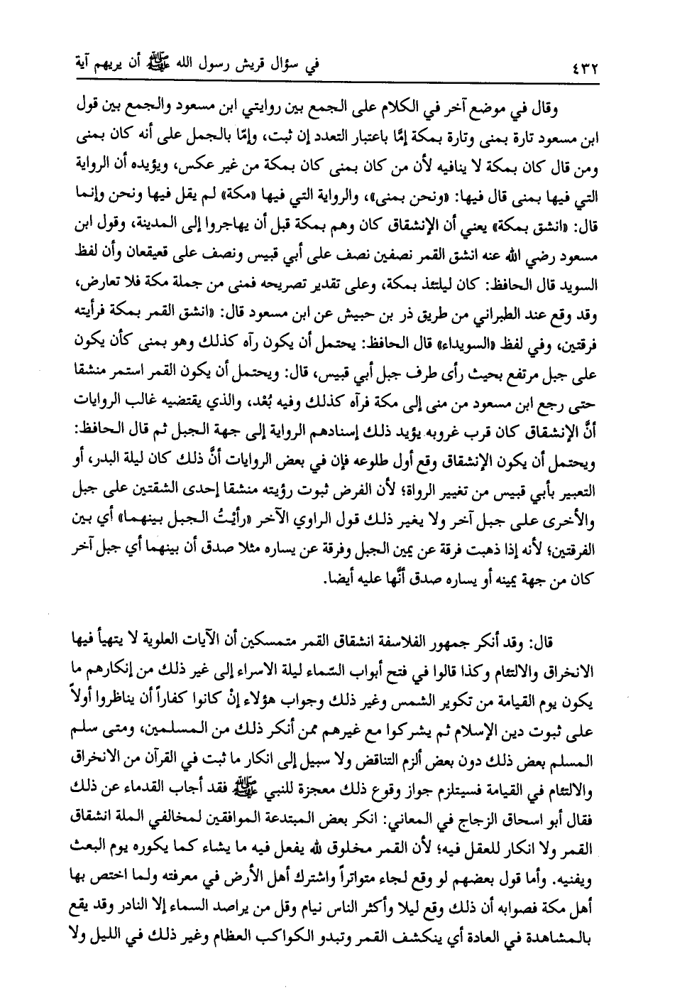 قال: وقد أنكر جمهور الفلاسفة انشقاق القمر متمسكين أن الآيات العلوية لا يتهيأ فيها الانخراق والالتئام وكذا قالوا في فتح أبواب السّماء ليلة الاسراء إلى غير ذلك من إنكارهم ما يكون يوم القيامة من تكوير الشمس وغير ذلك وجواب هؤلاء إن كانوا كفارا أن يناظروا أولا على ثبوت دين الإسلام ثم يشركوا مع غيرهم ممن أنكر ذلك من المسلمين، ومتى سلم المسلم بعض ذلك دون بعض ألزم التناقض ولا سبيل إلى انكار ما ثبت في القرآن من الانخراق والالتئام في القيامة فيستلزم جواز وقوع ذلك معجزة للنبي صلى الله عليه وسلم فقد أجاب القدماء عن ذلك فقال أبو إسحاق الزجاج في المعاني: أنكر بعض المبتدعة الموافقين لمخالفي الملة انشقاق القمر ولا انكار للعقل فيه، لأن القمر مخلوق لله يفعل فيه ما يشاء كما يكوره يوم البعث ويفنيه. وأما قول بعضهم لو وقع لجاء متواترا واشترك أهل الأرض في معرفته ولما اختص بها أهل مكة فجوابه أن ذلك وقع ليلا وأكثر الناس نيام وقل من يراصد السماء إلا النادر وقد يقع بالمشاهدة في العادة أي ينكشف القمر وتبدو الكواكب العظام وغير ذلك في الليل ولا