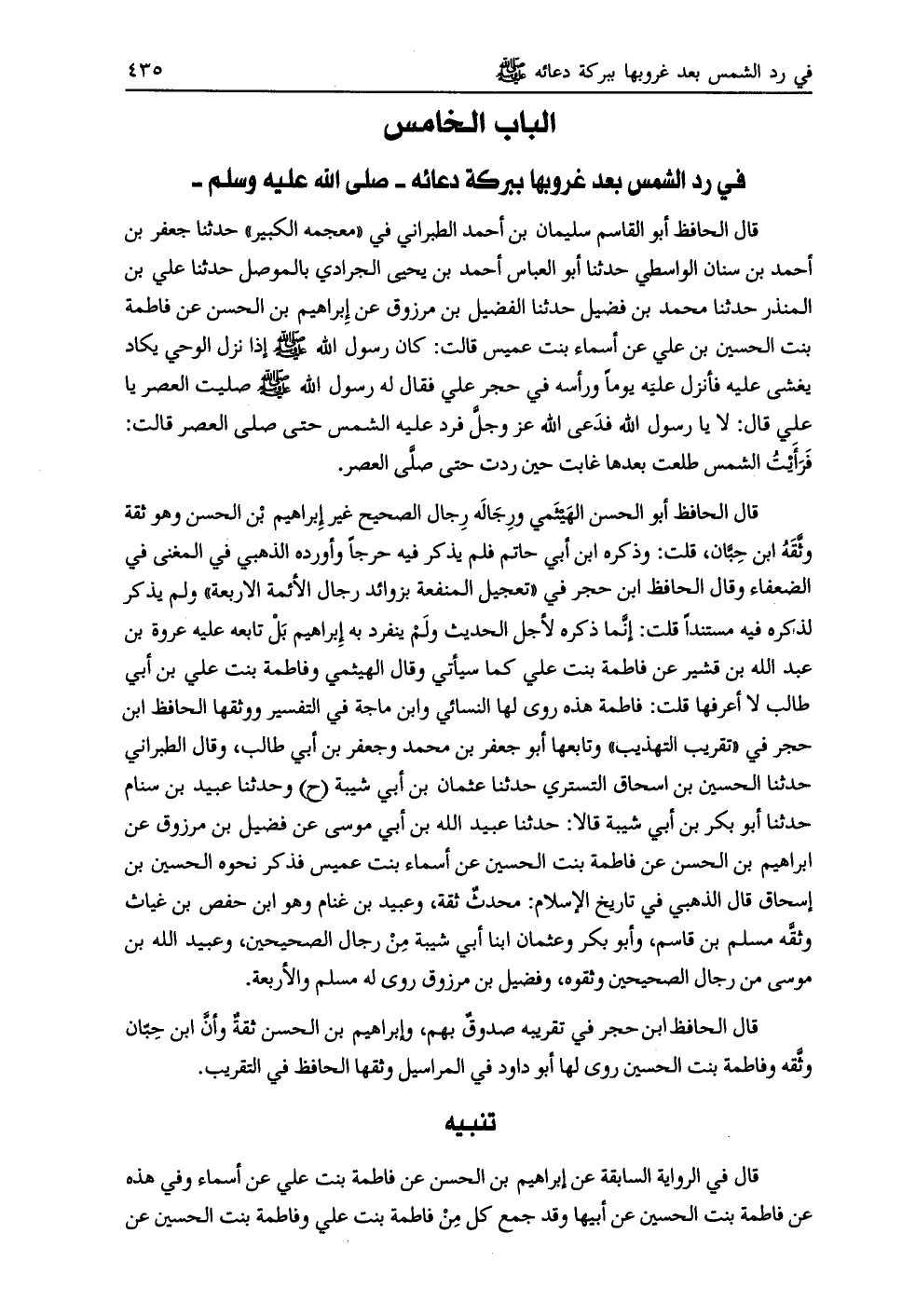 قال الحافظ أبو القاسم سليمان بن أحمد الطبراني في «معجمه الكبير» حدثنا جعفر بن أحمد بن سنان الواسطي حدثنا أبو العباس أحمد بن يحيى الجرادي بالموصل حدثنا علي بن المنذر حدثنا محمد بن فضيل حدثنا الفضيل بن مرزوق عن إبراهيم بن الحسن عن فاطمة بنت الحسين بن علي عن أسماء بنت عميس قالت: كان رسول الله صلى الله عليه وسلم إذا نزل الوحي يكاد يغشى عليه فأنزل عليه يوما ورأسه في حجر علي فقال له رسول الله صلى الله عليه وسلم صليت العصر يا علي قال: لا يا رسول الله فدعى الله عز وجل فرد عليه الشمس حتى صلى العصر قالت: