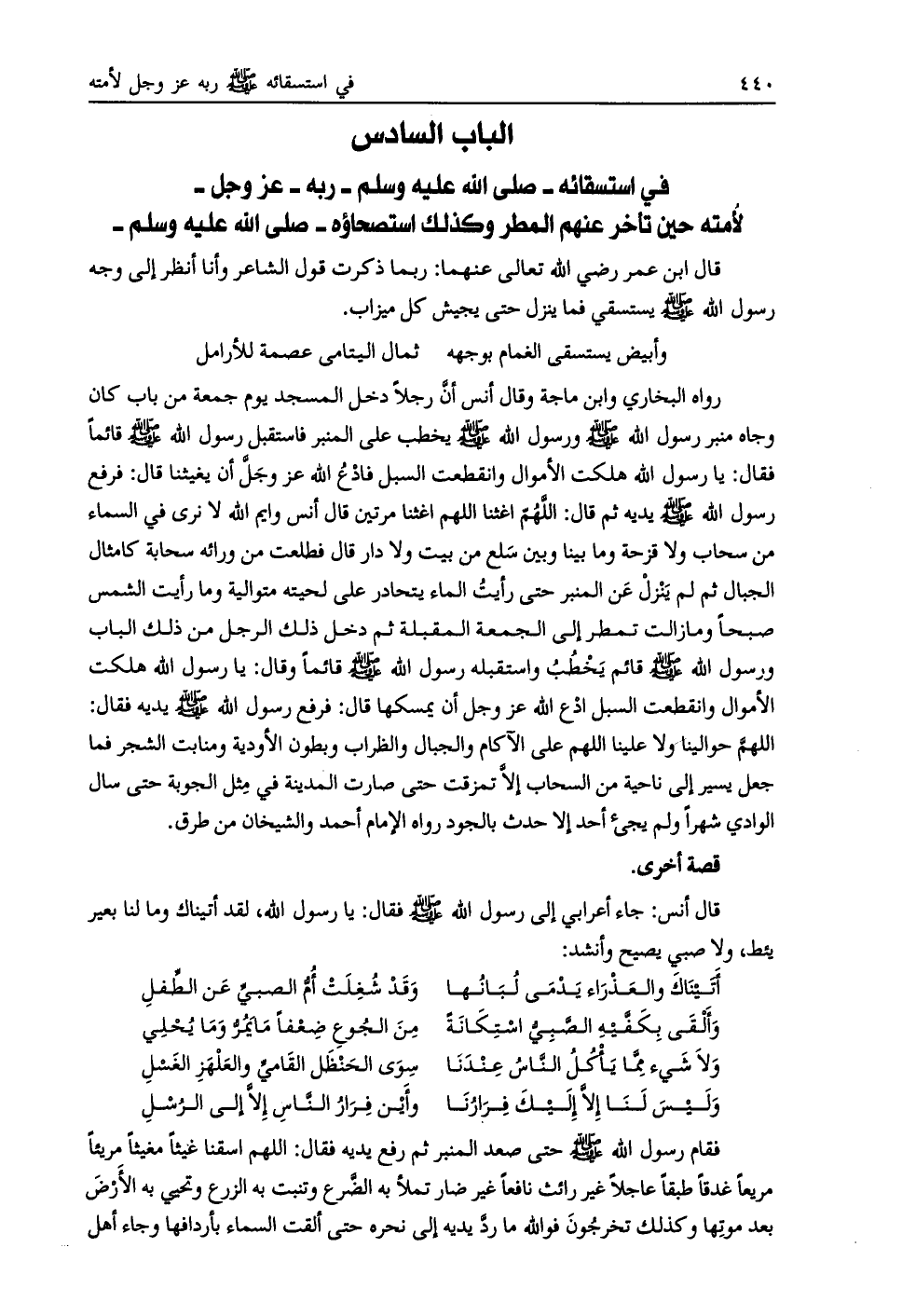 الباب السادس في استسقائه- صلّى الله عليه وسلم- ربه- عز وجل- لأمته حين تأخر عنهم المطر وكذلك استصحاؤه- صلى الله عليه وسلم-