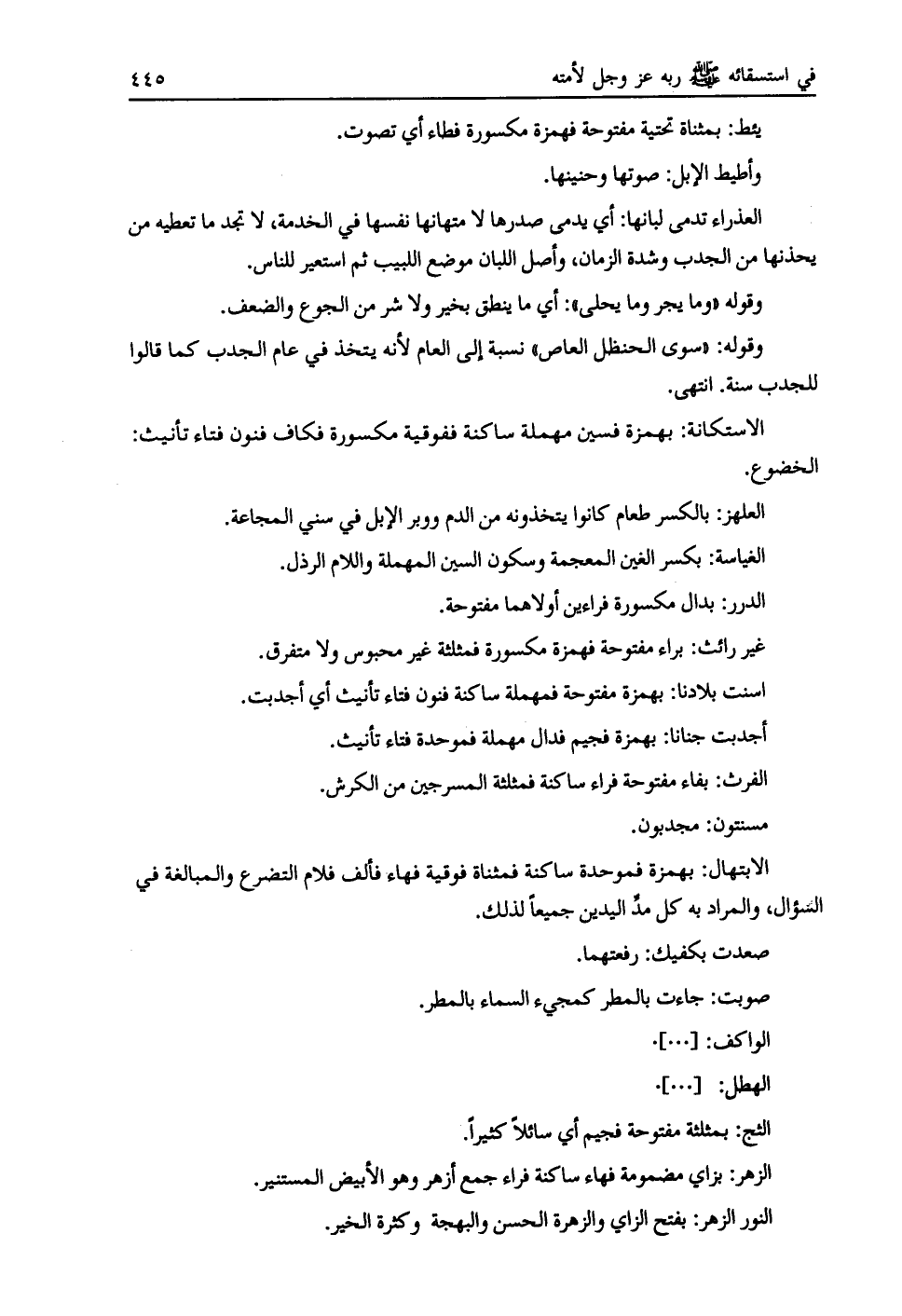 أسنت بلادنا: بهمزة مفتوحة فمهملة ساكنة فنون فتاء تأنيث أي أجدبت.