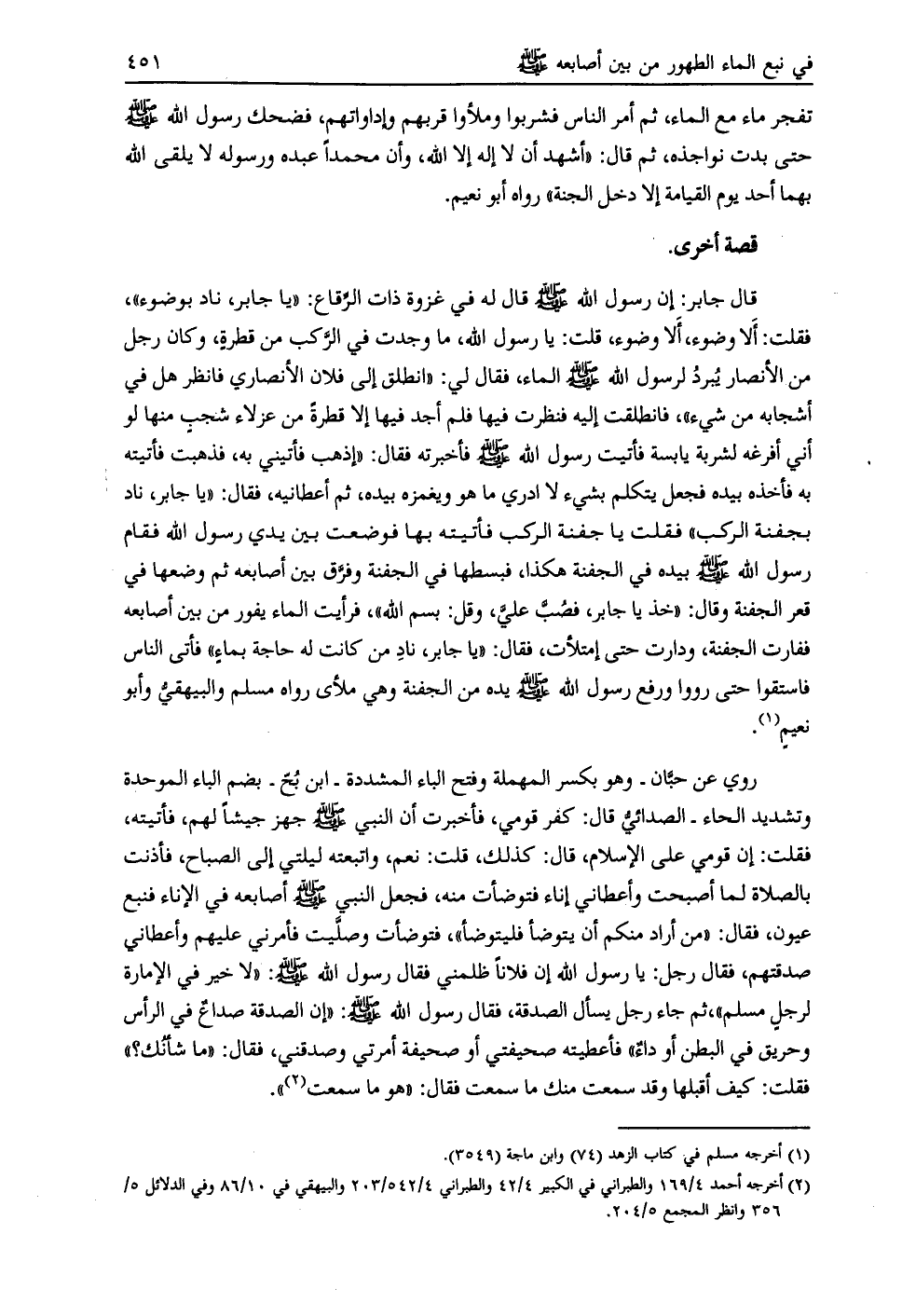 قال جابر: أن رسول الله صلى الله عليه وسلم قال له في غزوة ذات الرّقاع: «يا جابر، ناد بوضوء» ، فقلت: ألا وضوء، ألا وضوء، قلت: يا رسول الله، ما وجدت في الرّكب من قطرة، وكان رجل من الأنصار يبرد لرسول الله صلى الله عليه وسلم الماء، فقال لي: «انطلق إلى فلان الأنصاري فانظر هل في أشجابه من شيء» ، فانطلقت إليه فنظرت فيها فلم أجد فيها إلا قطرة من عزلاء شجب منها لو أني أفرغه لشربة يابسة فأتيت رسول الله صلى الله عليه وسلم فأخبرته فقال: «اذهب فأتيني به، فذهبت فأتيته به فأخذه بيده فجعل يتكلم بشيء لا أدري ما هو ويغمزه بيده، ثم أعطانيه، فقال: «يا جابر، ناد بجفنة الركب» فقلت يا جفنة الركب فأتيته بها فوضعت بين يدي رسول الله فقام رسول الله صلى الله عليه وسلم بيده في الجفنة هكذا، فبسطها في الجفنة وفرّق بين أصابعه ثم وضعها في قعر الجفنة وقال: «خذ يا جابر، فصبّ عليّ، وقل: بسم الله» ، فرأيت الماء يفور من بين أصابعه ففارت الجفنة، ودارت حتى امتلأت، فقال: «يا جابر، ناد من كانت له حاجة بماء» فأتى الناس فاستقوا حتى رووا ورفع رسول الله صلى الله عليه وسلم يده من الجفنة وهي ملأى رواه مسلم والبيهقي وأبو نعيم