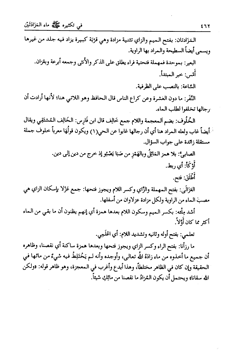 المزادتان: بفتح الميم والزاي تثنية مزادة وهي قربة كبيرة يزاد فيه جلد من غيرها ويسمى أيضا السطيحة والمراد بها الرواية.