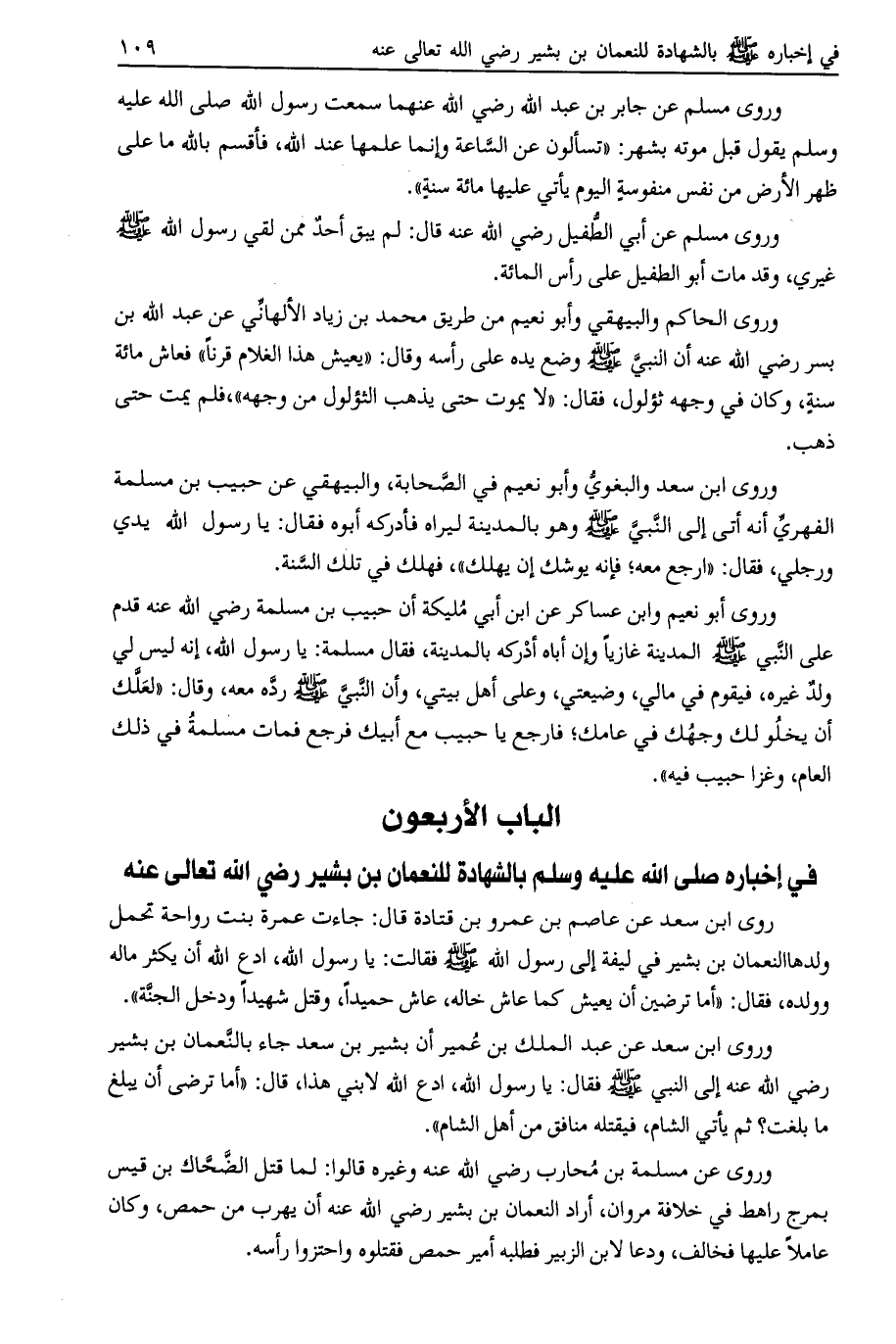 الباب الأربعون في إخباره صلى الله عليه وسلم بالشهادة للنعمان بن بشير رضي الله تعالى عنه