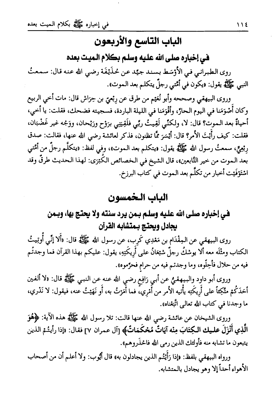 الباب الخمسون في إخباره صلى الله عليه وسلم بمن يرد سنته ولا يحتج بها، وبمن يجادل ويحتج بمتشابه القرآن