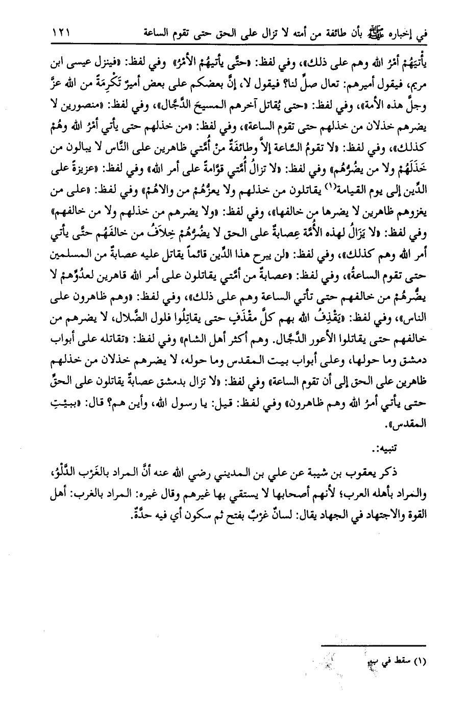 يأتيهم أمر الله وهم على ذلك» ، وفي لفظ: «حتى يأتيهم الأمر» وفي لفظ: «فينزل عيسى ابن مريم، فيقول أميرهم: تعالى صل لنا؟ فيقول لا، إن بعضكم على بعض أمير تكرمة من الله عز وجل هذه الأمة» ، وفي لفظ: «حتى يقاتل آخرهم المسيح الدجال» ، وفي لفظ: «منصورين لا يضرهم خذلان من خذلهم حتى تقوم الساعة» ، وفي لفظ: «من خذلهم حتى يأتي أمر الله وهم كذلك» ، وفي لفظ: «لا تقوم الساعة إلا وطائفة من أمتي ظاهرين على الناس لا يبالون من خذلهم ولا من يضرهم» وفي لفظ: «لا تزال أمتي قوامة على أمر الله» وفي لفظ: «عزيزة على الدين إلى يوم القيامة [ (1) ] يقاتلون من خذلهم ولا يعزهم من والاهم» وفي لفظ: «على من يغزوهم ظاهرين لا يضرها من خالفها» ، وفي لفظ: «ولا يضرهم من خذلهم ولا من خالفهم» وفي لفظ: «لا يزال لهذه الأمة عصابة على الحق لا يضرهم خلاف من خالفهم حتى يأتي أمر الله وهم كذلك» ، وفي لفظ: «لن يبرح هذا الدين قائما يقاتل عليه عصابة من المسلمين حتى تقوم الساعة» ، وفي لفظ: «عصابة من أمتي يقاتلون على أمر الله قاهرين لعدوهم لا يضرهم من خالفهم حتى تأتي الساعة وهم على ذلك» ، وفي لفظ: «وهم ظاهرون على الناس» ، وفي لفظ: «يقذف الله بهم كل مقذف حتى يقاتلوا فلول الضلال، لا يضرهم من خالفهم حتى يقاتلوا الأعور الدجال. وهم أكثر أهل الشام» وفي لفظ: «تقاتله على أبواب دمشق وما حولها، وعلى أبواب بيت المقدس وما حوله، لا يضرهم خذلان من خذلهم ظاهرين على الحق إلى أن تقوم الساعة» وفي لفظ: «لا تزال بدمشق عصابة يقاتلون على الحق حتى يأتي أمر الله وهم ظاهرون» وفي لفظ: قيل: يا رسول الله، وأين هم؟ قال: «ببيت المقدس» .