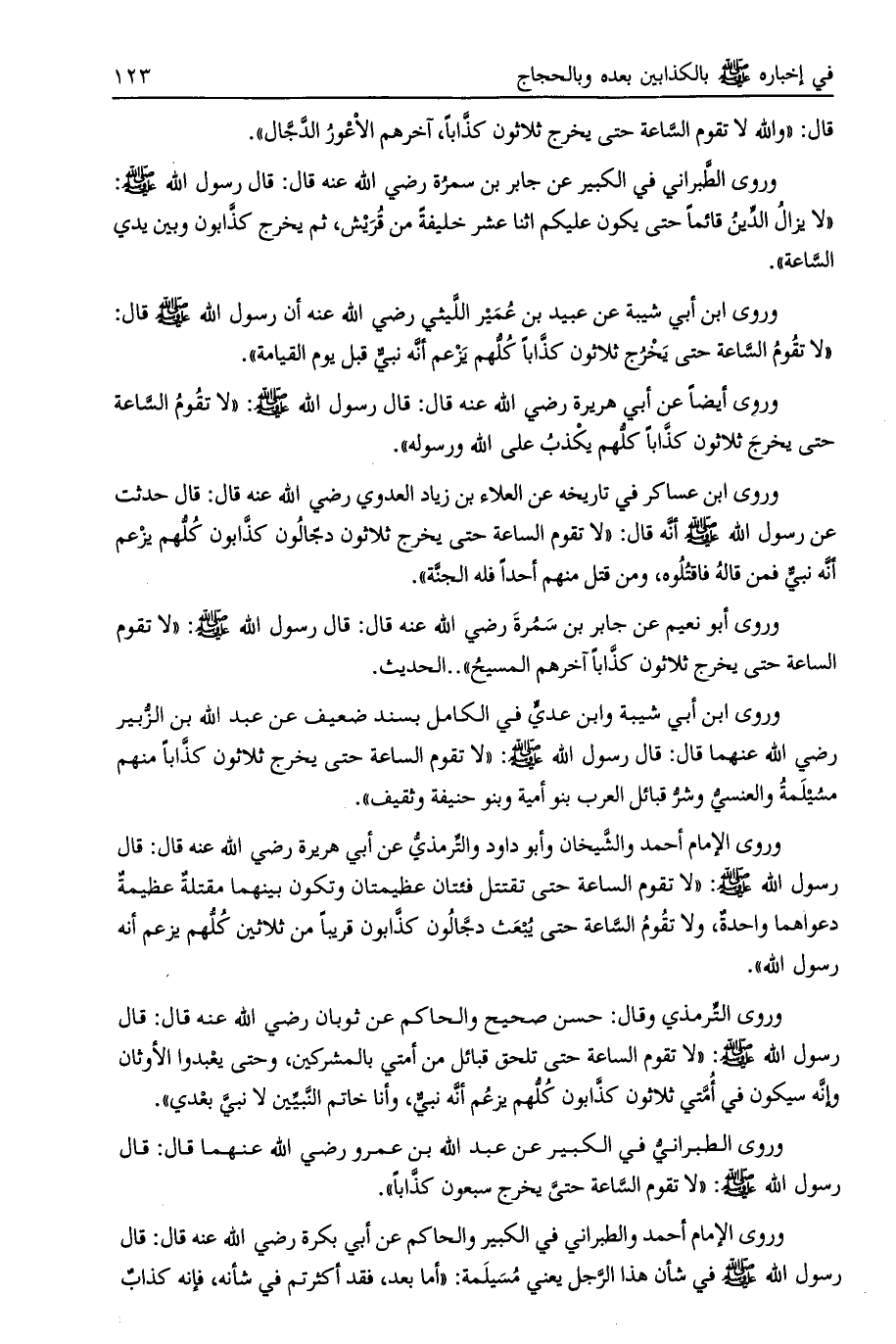 وروى الطبراني في الكبير عن عبد الله بن عمرو رضي الله عنهما قال: قال رسول الله صلى الله عليه وسلم: «لا تقوم الساعة حتى يخرج سبعون كذابا» .