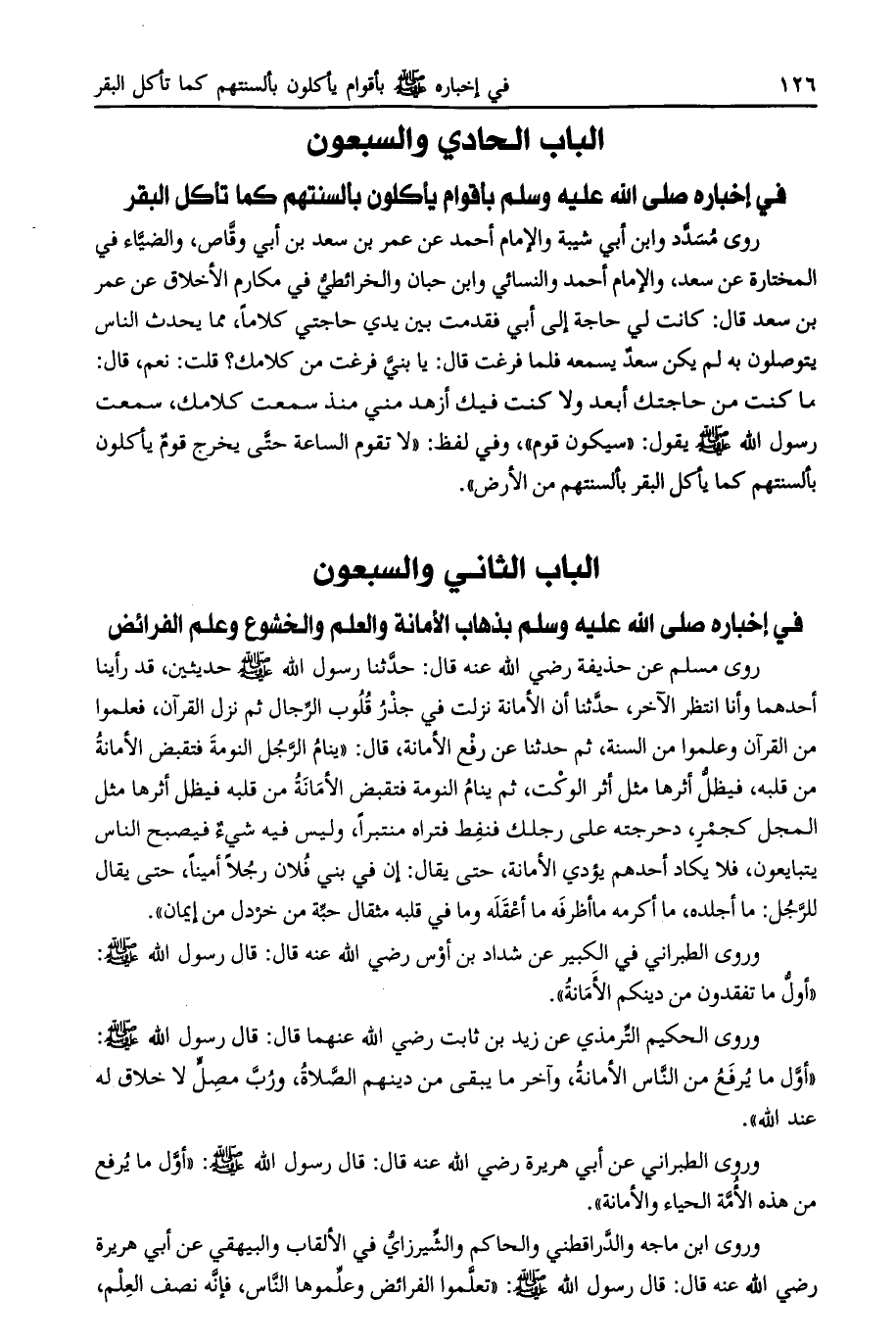 الباب الحادي والسبعون في إخباره صلى الله عليه وسلم بأقوام يأكلون بألسنتهم كما تأكل البقر