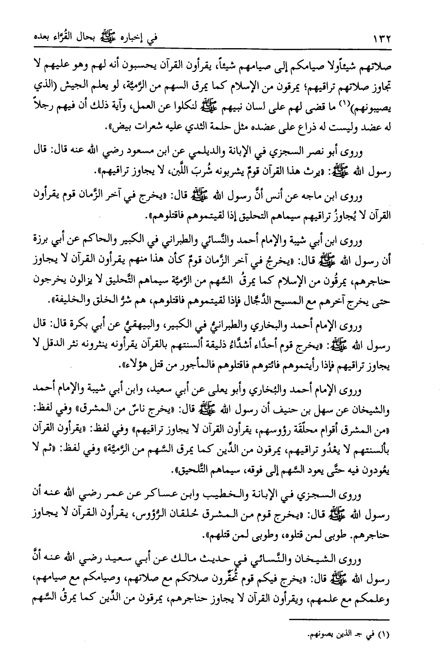 وروى الشيخان والنسائي في حديث مالك عن أبي سعيد رضي الله عنه أن رسول الله صلى الله عليه وسلم قال: «يخرج فيكم قوم تحقرون صلاتكم مع صلاتهم، وصيامكم مع صيامهم، وعلمكم مع علمهم، ويقرأون القرآن لا يجاوز حناجرهم، يمرقون من الدين كما يمرق السهم