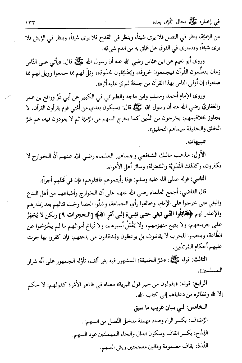 الخامس: في بيان غريب ما سبق الرصاف: بكسر الراء وصاد مهملة مدخل النصل من السهم: