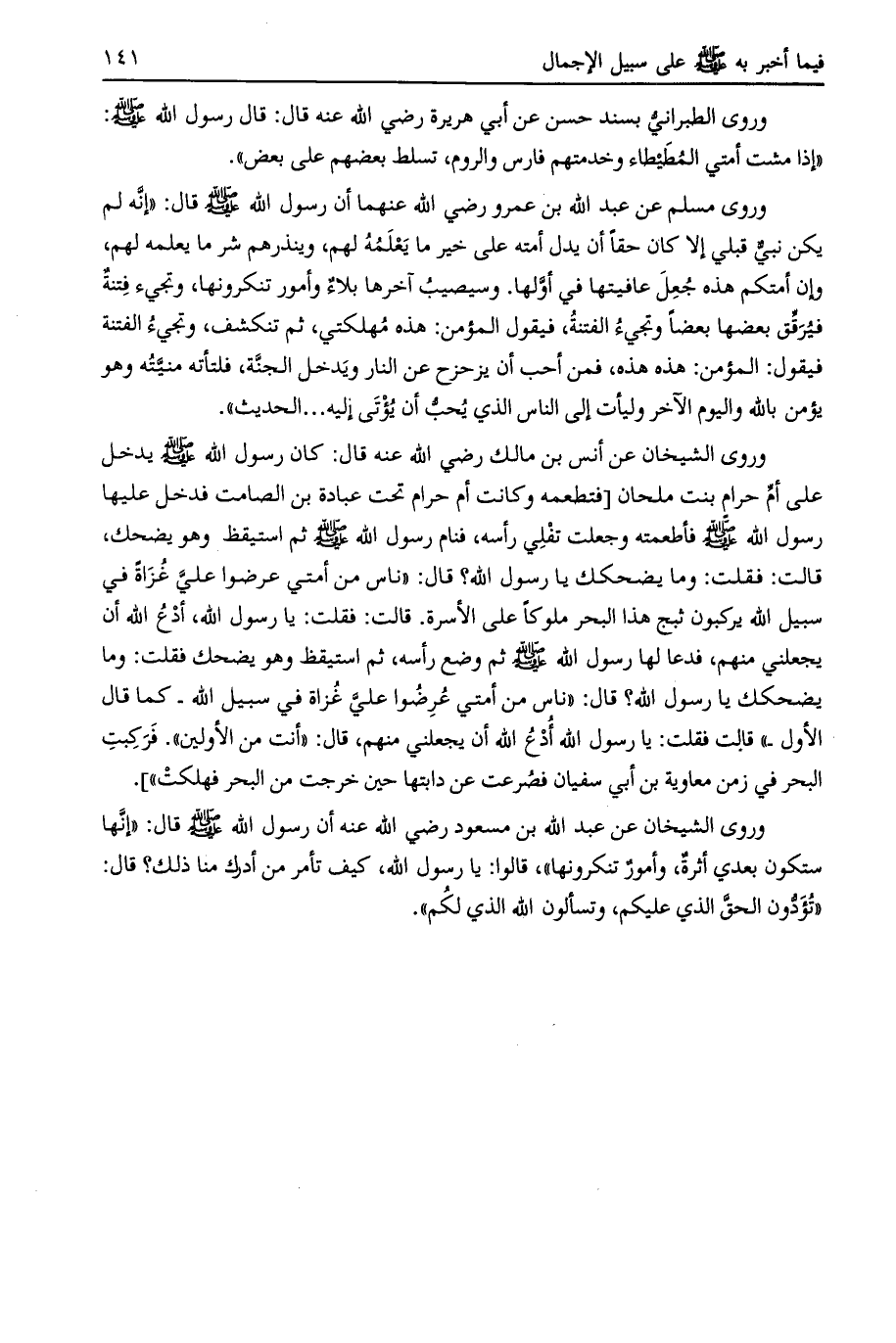وروى الشيخان عن أنس بن مالك رضي الله عنه قال: كان رسول الله صلى الله عليه وسلم يدخل على أم حرام بنت ملحان [فتطعمه وكان أم حرام تحت عبادة بن الصامت فدخل عليها رسول الله صلى الله عليه وسلم فأطعمته وجعلت تفلي رأسه، فنام رسول الله صلى الله عليه وسلم ثم استيقظ وهو يضحك، قالت: فقلت: وما يضحك يا رسول الله؟ قال: «ناس من أمتي عرضوا علي غزاة في سبيل الله يركبون ثبج هذا البحر ملوكا على الأسرة. قالت: فقلت: يا رسول الله، ادع الله أن يجعلني منهم، فدعا لها رسول الله صلى الله عليه وسلم ثم وضع رأسه، ثم استيقظ وهو يضحك فقلت: وما يضحك يا رسول الله؟ قال: «ناس من أمتي عرضوا علي غزاة في سبيل الله- كما قال الأول-» قالت فقلت: يا رسول الله ادع الله أن يجعلني منهم، قال: «أنت من الأولين» . فركبت البحر في زمن معاوية بن أبي سفيان فصرعت عن دابتها حين خرجت من البحر فهلكت» ] .