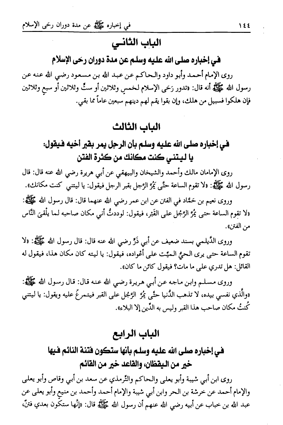الباب الثالث في إخباره صلى الله عليه وسلم بأن الرجل يمر بقبر أخيه فيقول: يا ليتني كنت مكانك من كثرة الفتن