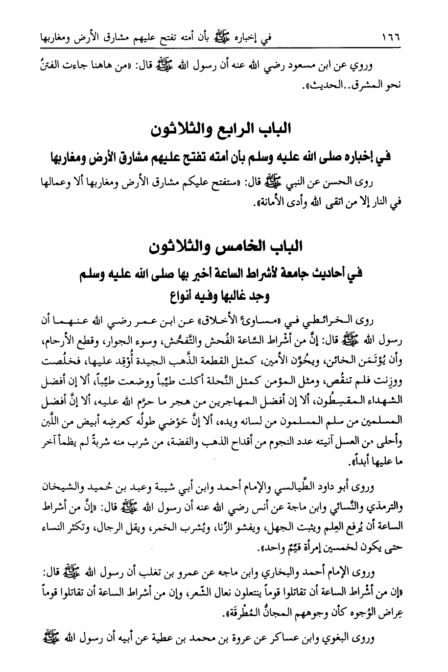 الباب الخامس والثلاثون في أحاديث جامعة لأشراط الساعة أخبر بها صلى الله عليه وسلم وجد غالبها وفيه أنواع