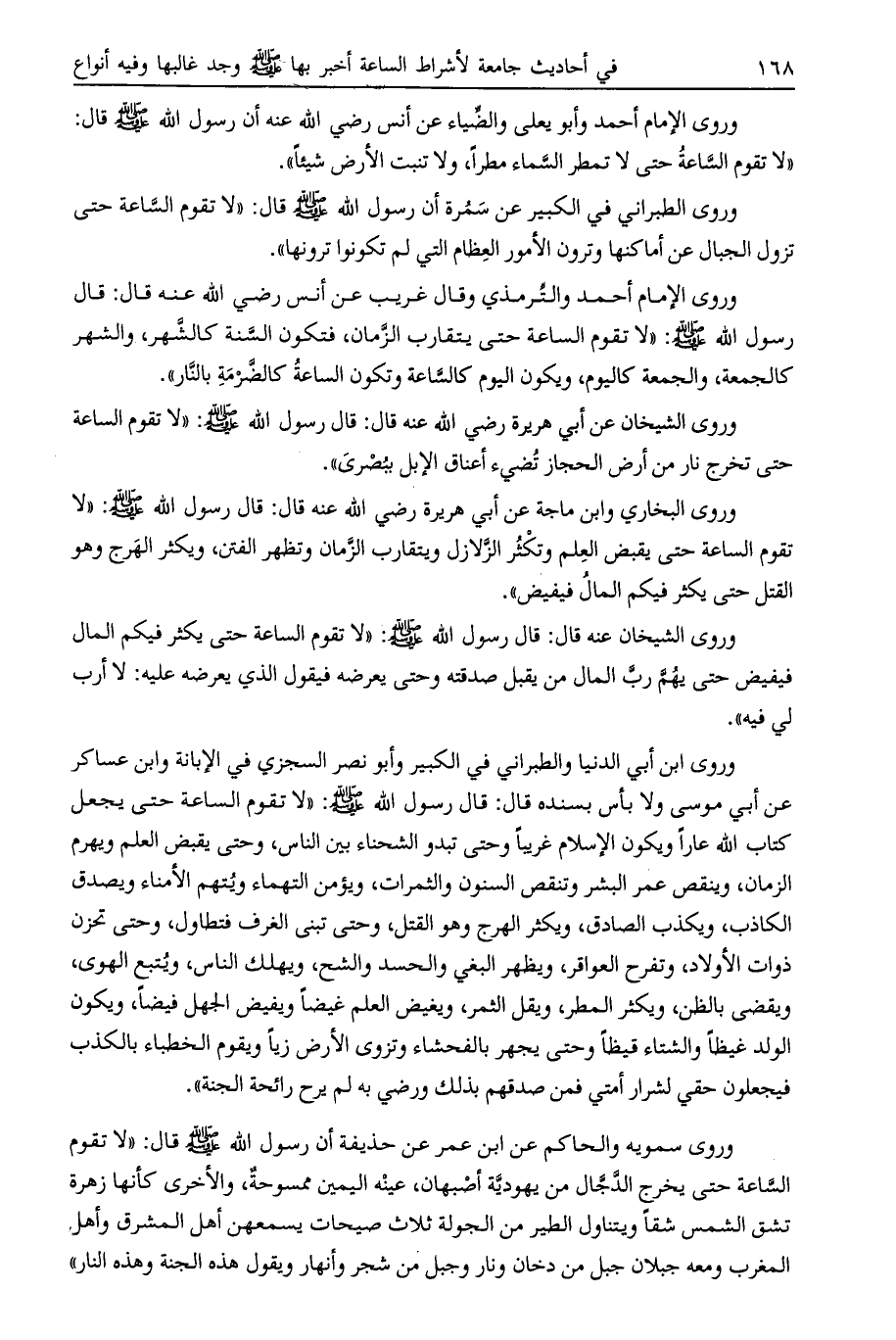 وروى البخاري وابن ماجه عن أبي هريرة رضي الله عنه قال: قال رسول الله صلى الله عليه وسلم: «لا تقوم الساعة حتى يقبض العلم وتكثر الزلازل ويتقارب الزمان وتظهر الفتن، ويكثر الهرج وهو القتل حتى يكثر فيكم المال فيفيض» .