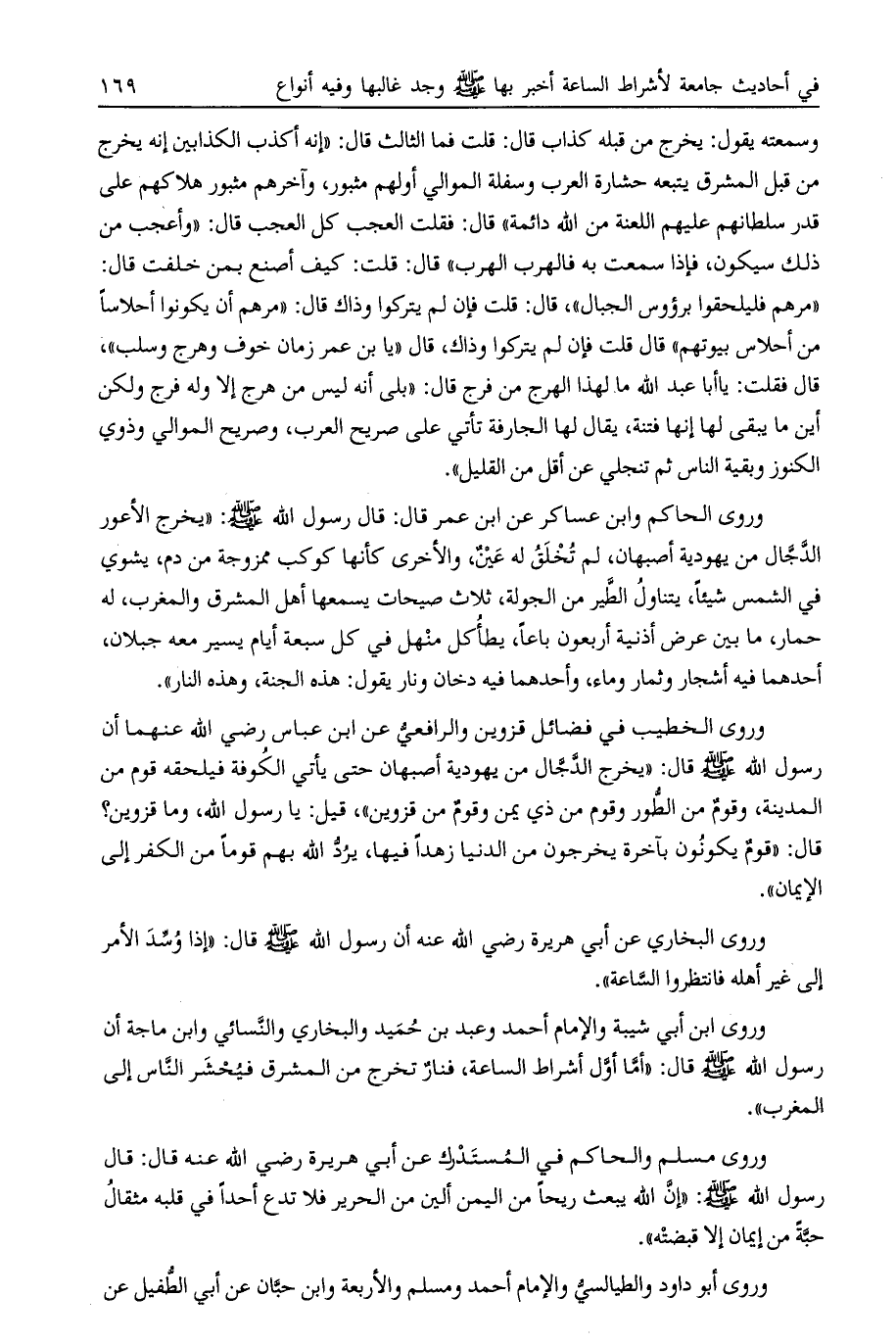 وسمعته يقول: يخرج من قبله كذاب قال: قلت فما الثالث قال: «إنه أكذب الكذابين إنه يخرج من قبل المشرق يتبعه حشارة العرب وسفلة الموالي أولهم مثبور، وآخرهم مثبور هلاكهم على قدر سلطانهم عليهم اللعنة من الله دائمة» قال: فقلت العجب كل العجب قال: «وأعجب من ذلك سيكون، فإذا سمعت به فالهرب الهرب» قال: قلت: كيف أصنع بمن خلفت قال: