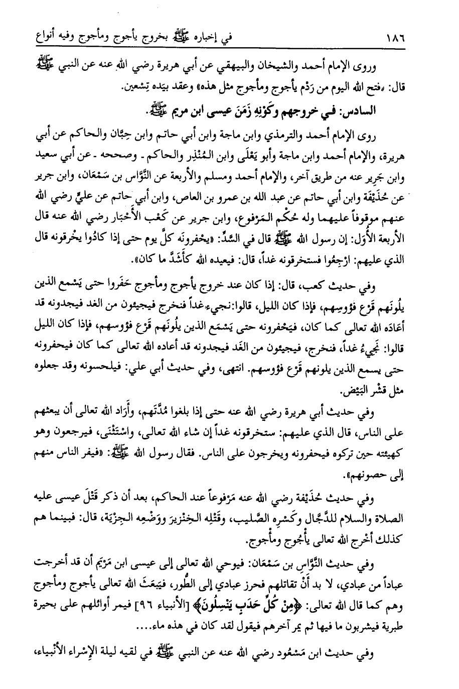 روى الإمام أحمد والترمذي وابن ماجة وابن أبي حاتم وابن حبان والحاكم عن أبي هريرة، والإمام أحمد وابن ماجة وأبو يعلى وابن المنذر والحاكم- وصححه- عن أبي سعيد وابن جرير عنه من طريق آخر، والإمام أحمد ومسلم والأربعة عن النواس بن سمعان، وابن جرير عن حذيفة وابن أبي حاتم عن عبد الله بن عمرو بن العاص، وابن أبي حاتم عن علي رضي الله عنهم موقوفا عليهما وله حكم المرفوع، وابن جرير عن كعب الأحبار رضي الله عنه قال الأربعة الأول: إن رسول الله صلى الله عليه وسلم قال في السد: «يحفرونه كل يوم حتى إذا كادوا يخرقونه قال الذي عليهم: ارجعوا فستخرقونه غدا، قال: فيعيده الله كأشد ما كان» .
