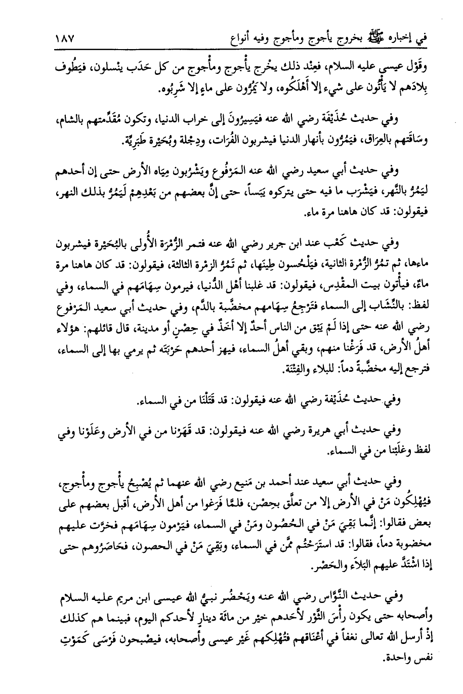 وقول عيسى عليه السلام، فعند ذلك يخرج يأجوج ومأجوج من كل حدب ينسلون، فيطوف بلادهم لا يأتون على شيء إلا أهلكوه، ولا يمرون على ماء إلا شربوه.