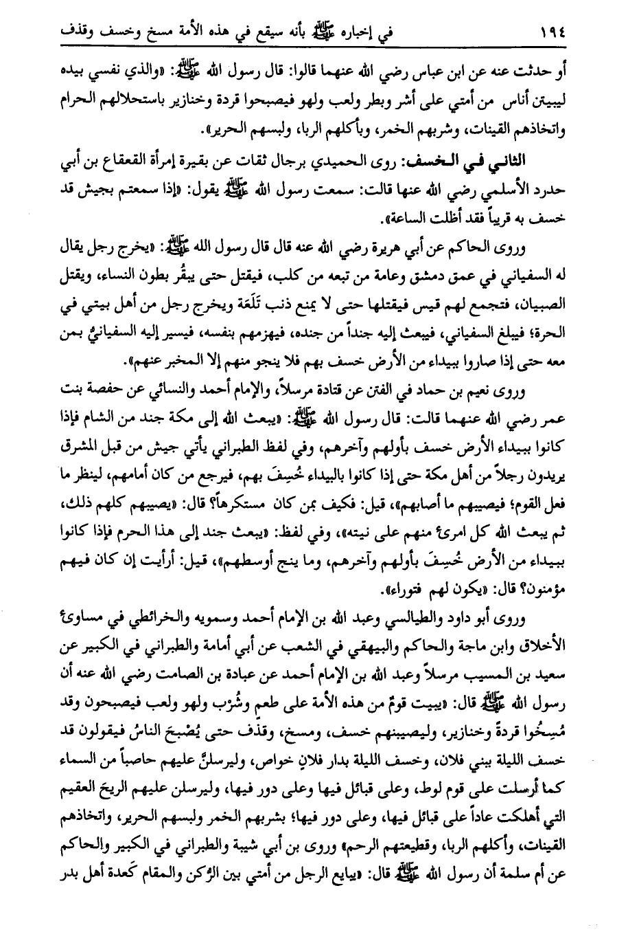 وروى أبو داود والطيالسي وعبد الله بن الإمام أحمد وسمويه والخرائطي في مساوئ الأخلاق وابن ماجة والحاكم والبيهقي في الشعب عن أبي أمامة والطبراني في الكبير عن سعيد بن المسيب مرسلا وعبد الله بن الإمام أحمد عن عبادة بن الصامت رضي الله عنه أن رسول الله صلى الله عليه وسلم قال: «يبيت قوم من هذه الأمة على طعم وشرب ولهو ولعب فيصبحون وقد مسخوا قردة وخنازير، وليصيبنهم خسف، ومسخ، وقذف حتى يصبح الناس فيقولون قد خسف الليلة ببني فلان، وخسف الليلة بدار فلان خواص، وليرسلن عليهم حاصبا من السماء كما أرسلت على قوم لوط، وعلى قبائل فيها وعلى دور فيها، وليرسلن عليهم الريح العقيم التي أهلكت عادا على قبائل فيها، وعلى دور فيها، بشربهم الخمر ولبسهم الحرير، واتخاذهم القينات، وأكلهم الربا، وقطيعتهم الرحم»
