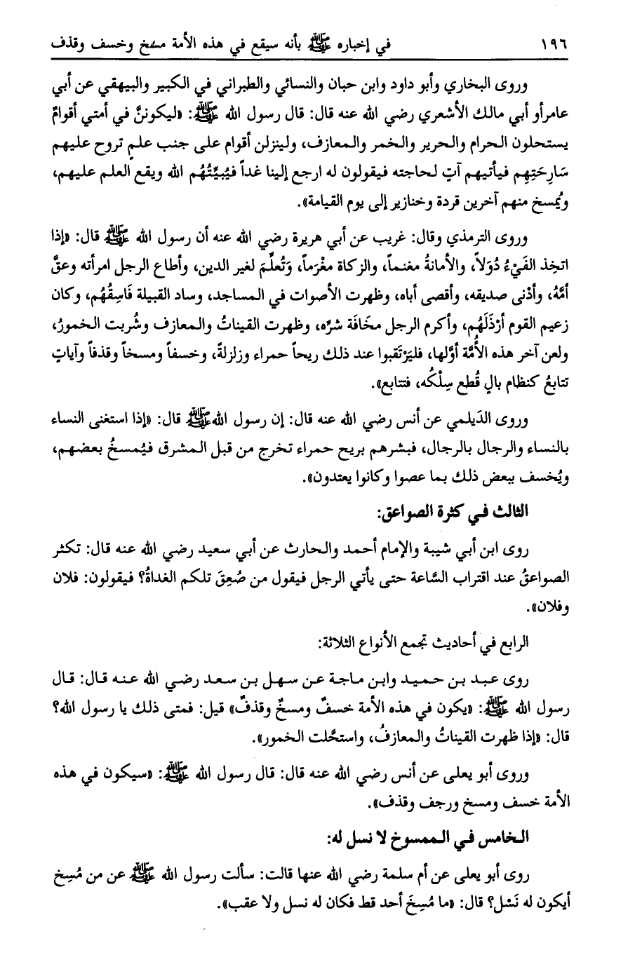 روى عبد بن حميد وابن ماجة عن سهل بن سعد رضي الله عنه قال: قال رسول الله صلى الله عليه وسلم: «يكون في هذه الأمة خسف ومسخ وقذف» قيل: فمتى ذلك يا رسول الله؟
