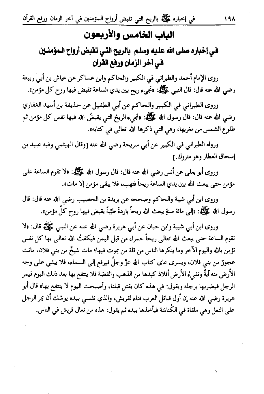الباب الخامس والأربعون في إخباره صلى الله عليه وسلم بالريح التي تقبض أرواح المؤمنين في آخر الزمان ورفع القرآن